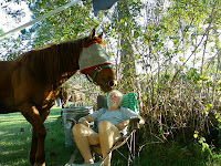 Trailered the horses out to DuPuis and took a nice long ride with Hubby today. It was going really well, the horses were having a great time, the weather was perfect, until we started a nice long canter on a really sweet spot of straightaway, with nice grass footing. Hubby and his mare Clio got a little ahead of me, and, right on cue, saw something off to her right that caused her to veer suddenly to the left. Unfortunately, Hubby was out of the saddle at the time, so one second he was enjoying a nice canter and the next there was no horse between him and the ground. He took a tumble, which fortunately was on pretty soft ground, so after a few minutes of getting his breath back, I packed a cold pack from the first aid kit on his hip where he fell, and soon we were off again, albeit at a somewhat slower pace (darn!). The rest of the day was pretty uneventful, and the icepack helped Hubby make it through okay, and we did manage to get a few more jogs in. We were on the trail almost four hours, and it was a lovely day. We had inadvertently taken the same trail that I had taken with my brother on Sunday (I had planned to do the same trail in reverse, but got started off wrong somehow), but it was new to Hubby, so that made it worthwhile. A fabulous day, just the kind we live for!