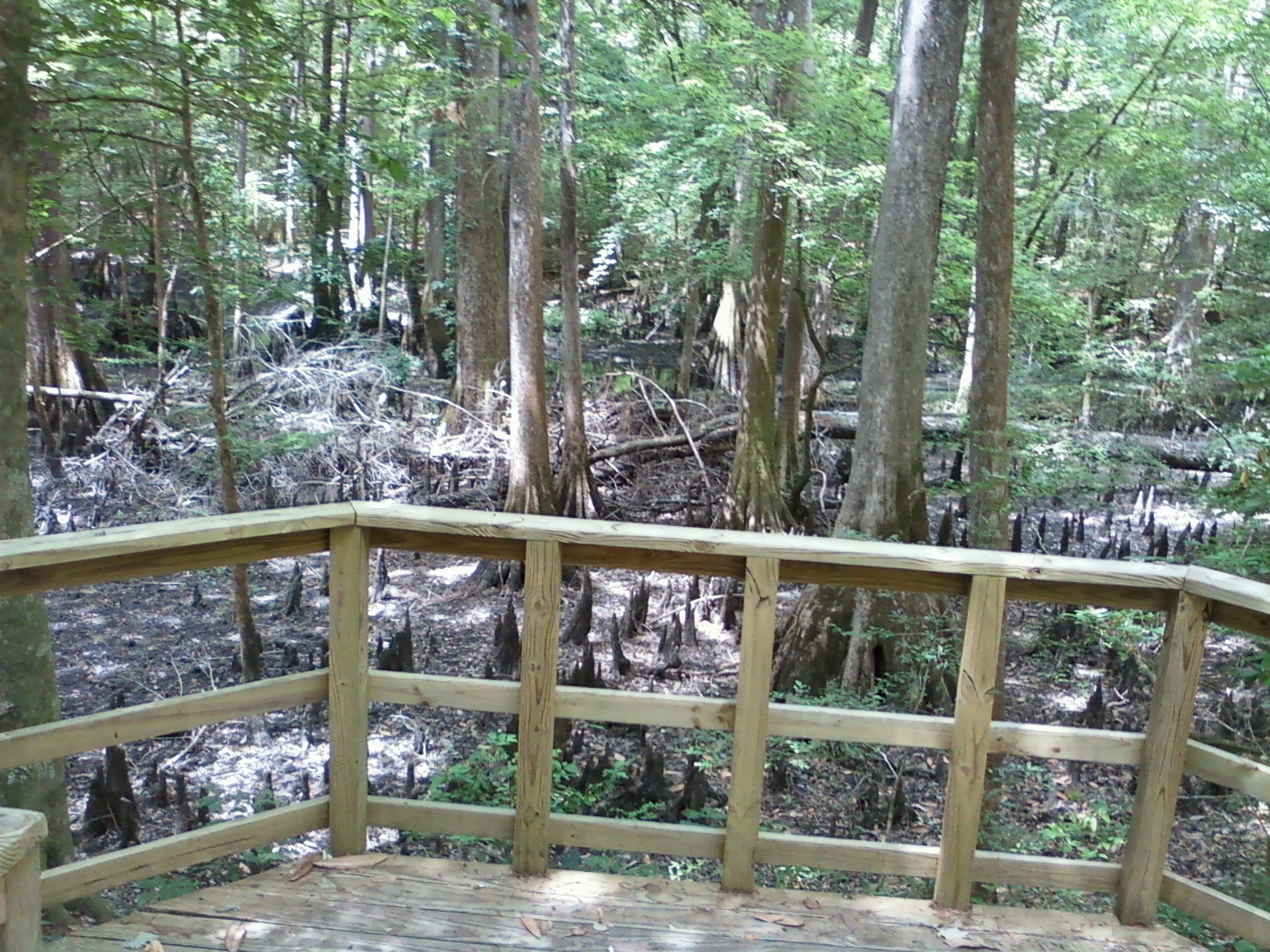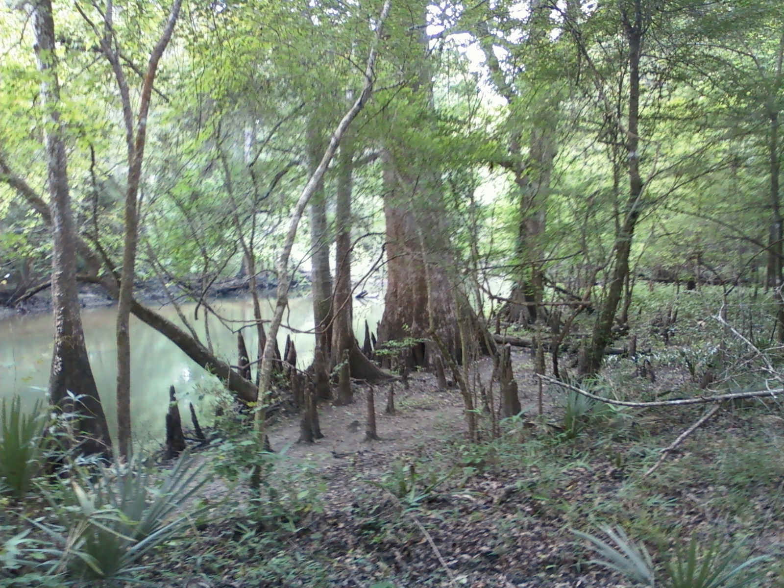 Got up early again with the ambition to ride before the heat of the day, but received an early email from our local client that his schedule had changed and he wouldn’t be able to meet with us later this week, so we started planning our departure for tomorrow. Then it occurred to us that it was early, and we could be packed in less than an hour, and we would have plenty of time to get out today if we wanted to move on, so that’s what we decided to do. On the road before 11:00, one stop at the Walmart in Marianna for fuel and food supplies, then into the park shortly after three, having gained an hour by moving into Central Time. As we’d been here before, setup was easier, and since they have corrals here, we didn’t even have to put up a highline. In fact, I put the horses out on their boat anchor for a while, as the clearing here was full of nice green grass and even some clover, which the horses devoured voraciously. Got them settled into their stall at dusk, and then settled ourselves for the night, not sure how long we’re going to be here, but enjoying the freedom and the moment that such quick decisions allow!Monday, April 30, 2012 – Another Ride at Cary State Forest