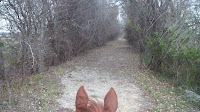 After a morning of getting caught up on business, we decided to knock out a bunch of the little meandering trails they have “inside” the Paradise Loop. Their maps are not very clear, even though they’re posted at every intersection, and we ended up missing one of them, but it was still a fabulous ride. Mostly it was through those lovely, crowded cedar tree tunnels (very spooky, but fun), with a couple of clear areas where we got in a few canters. Apollo on his best behaviour today, no leaping or jumping. I don’t know if it was because he got it all out of his system yesterday, or if it was because I didn’t put the saddle bags on him today, or because I added back one small extra cushion pad under his saddle, but I liked it! Think I’ll have to try out each thing one at a time to see if it makes a difference, and try to narrow down the cause of his rodeo-ing. Anyway, it was a great ride, and the weather finally warmed up to the upper sixties, with a nice warm southerly breeze, just what we had expected for Texas at this time of year, but haven’t really seen yet. Hopefully we’ve seen all the winter we’re going to get! (fingers crossed!) Did a little prep work for tomorrow’s departure, supposed to stay pretty warm all week, thank goodness. Next place will be a bit more primitive, but it’s only for 5 nights. Getting rather spoiled with water and electric so close. Love the Army Corp of Engineers here! They’ve done great job! No pix today, my video camera battery died!