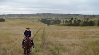 If you ever want to come someplace where you truly feel like you’re all alone in the wilderness, this is the place! From this campground, you can’t see a single structure other than the two vault toilets and the corrals, for as far as the eye can see! I even got out the binoculars and could just barely make out some kind of farm many miles away, not viewable with the naked eye. It was so quiet last night, it was hard to get used to after being in so many places where you could hear traffic noise, or tourists driving by. No one would ever come out here by accident, not subjecting themselves to 6 miles of bad road to get here, that’s for sure! After a leisurely breakfast, we saddled up the horses and headed out on what I had planned to be a short, five mile or so loop around the western part of Ft. Robinson State Park. We crossed the water crossing and started heading up through the grasslands, until we reached a gate. According to my GPS (which was a map based on the printed map from the BLM), if we went through the gate, we’d be going in the wrong direction, even though that’s the way the white trail markers went. Instead, we followed a fenceline that seemed to take us in the right direction, but soon my GPS was showing we were going way off track. Instead of turning around, we decided to continue along the fenceline until it met up with the back half of the loop, then follow it backwards. At least then we wouldn’t have to follow the road at the end of the trip, which was our original plan. When we reached the intersection, we saw the trail clearly straight in front of us (though, it turned out that we should have headed left at a lesser marked intersection) and climbed up a long grade to the top of the bluff, where we were met with some simply spectacular views! All 360 degrees around us were incredible, the kind of view that just can’t be done justice by a few pictures or a verbal description. Absolutely stunning! We continue to follow along the well-marked trail for a while, passing several markers laying on the ground, but it seemed to be heading along just fine. Then we came to a place where there was a picnic table and what looked like a collapsed shelter, and just beyond that, we came across a small herd of more than a dozen horses! I doubt they were wild, someone likely just had them grazing out there, but they were definitely related to each other, and they were beautiful! Several red roans with gorgeous faces, a couple of rare blue roans, some grays and whites, and two sorrels, one that looked a lot like my Apollo, though with a larger blaze than his perfect diamond. Well naturally, my guy got a bit excited by that, and we had a few scary moments while we tried to pass them, though they were planted right at a marker, but we saw the next marker and made a beeline there. Curious, the horses kind of followed us, which made my guy more antsy, but eventually we got around them to where the next marker was. That led to a gate, which was next to a pasture with some cows in it. After just one short startled moment when he spotted the cows, Apollo was very good about ignoring them, for which I was grateful. Quite a change from just a few months ago! Well, after all, we’ve conquered buffalo in the wild, right? What’s a couple of cows anymore? We went through the gate, and after a short bit, I checked my GPS, which confirmed what I had already suspected, we were going WAY off track, in exactly the opposite direction we needed to go to get back to camp. The problem here is that there are no markers except white diamonds, and white diamonds are used on EVERY trail! So, unfortunately, we had to turn around, deal with the gate, the cows and the horses once again, past the picnic table, until just beyond that we came to a marker that was on the ground. We had seen it before, but what we hadn’t seen was that in addition to the marker that was directly in front of us (and the one we followed), there was an additional marker to our sharp left (which was now almost directly in front of us on the return.) So we got back on track there, and followed that trail, which fortunately at least was in the same general vicinity as the GPS said it would be. This trail basically followed the ridgeline, so the views were universally spectacular, with every curve providing another view of distant horizons. We could even see what looked like the Black Hills from here! Fantastic! Another mile or so on and we ran into yet ANOTHER small herd of horses, mostly white and gray, a couple of which were huge draft horses, and a burro with paint coloring, which I’d never seen before. Of course, they were right in the middle of the trail, and we did our best to skirt them, and managed to get by with only one scary moment when Apollo had the urge to back himself toward the group, which I saw as an invitation to a kicking match, but I managed to get him out of there before any excitement began. The rest of the trip was uneventful, though there were a few rather steep rocky sections coming down that way. For the most part, we probably didn’t need boots, but for those areas where we did, we were very glad to have them. Got back to camp and got everyone settled, then anxiously downloaded my GPS info onto my computer, since this seemed to be a classic case of what the maps says and what’s on the ground as completely different from each other. It turned out that our 5 mile trip ended up being 8.25 miles, and less than half of it was on trails that I had designated as our path. I learned that we missed one intersection completely, and that the GPS trail made from the hard copy map didn’t seem to have much in common. I can’t say I was too surprised, because when I tried to line up the overlay on Google Earth, it didn’t seem to match up very well, even on the highly visible landmarks like roads! Well, still, it was a great ride, we saw fabulous views, everyone got home safe and sound, and ultimately,
