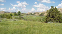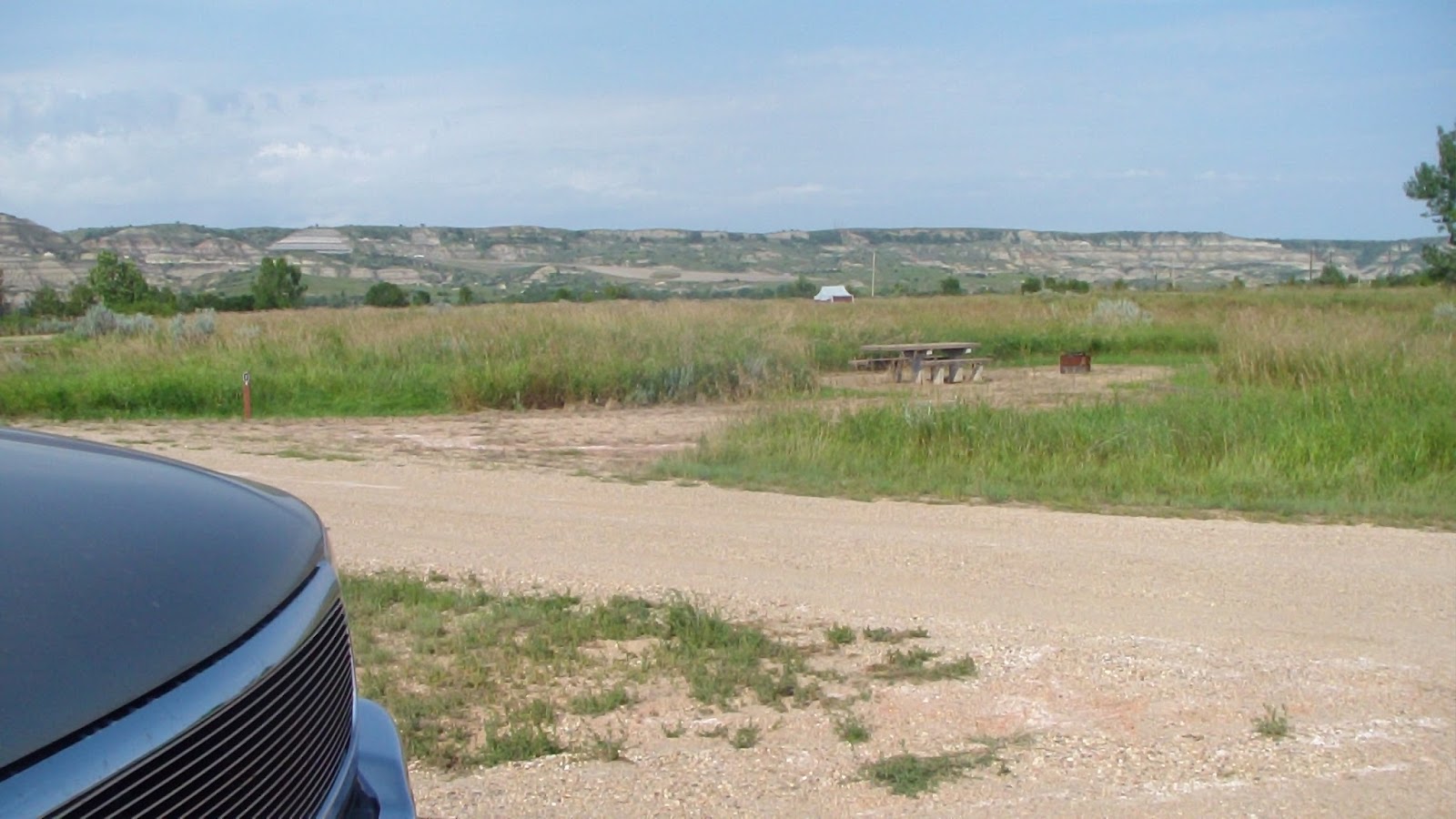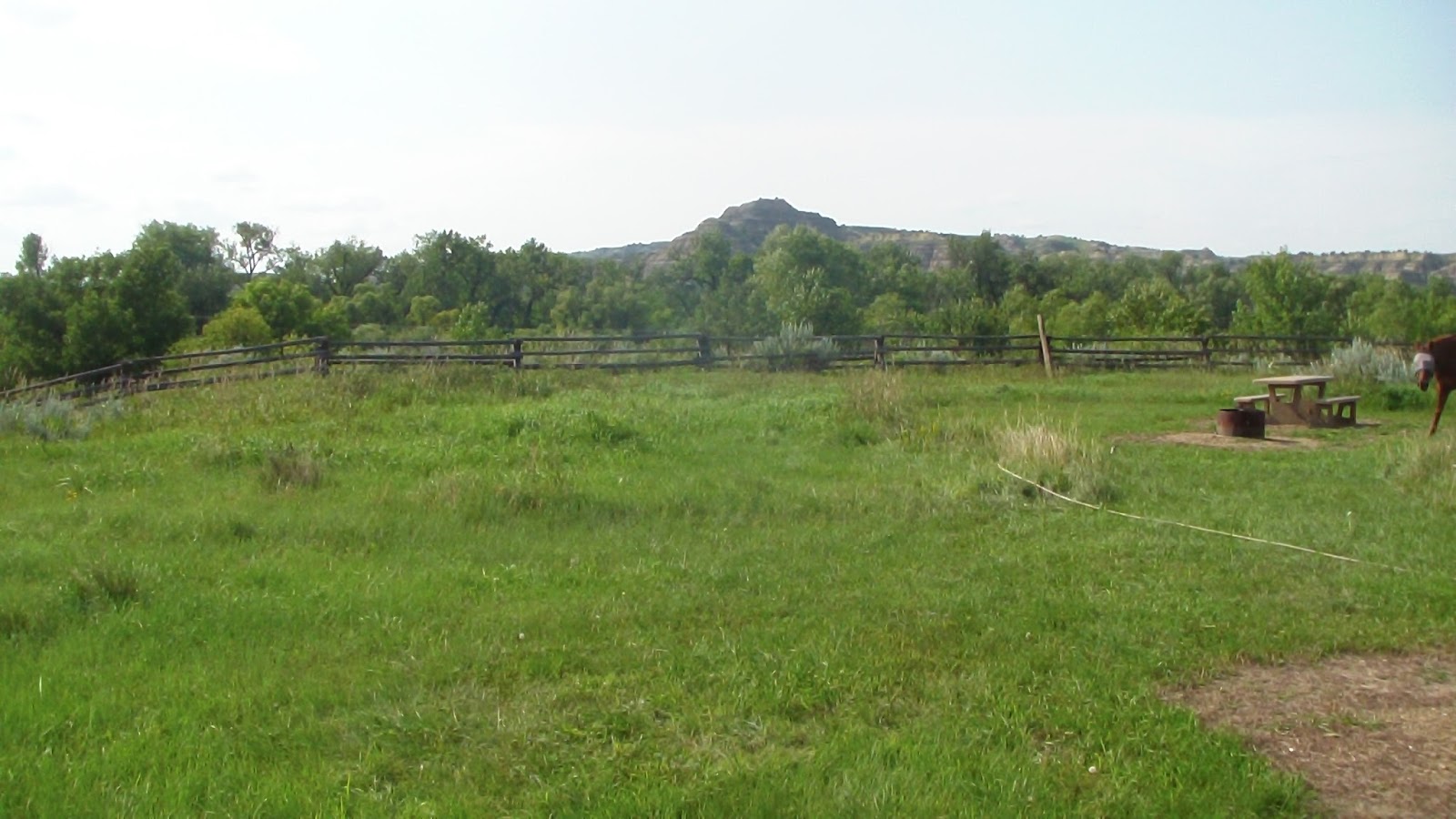 Woke up early to the alarm, knowing that while the trip was relatively short, the errands and stops we had to make would make it a long day, and sure enough, it did. First stop, breakfast at Burger King, next stop, Runnings Farm and Fleet, third stop, Walmart, where I filled up the RV, the horse trailer and BOTH portable barrels, as the only water at the CCC camp at the Little MO Grasslands National Forest was a single hand pump and we planned on staying a week, so we would likely need it all, but I accidentally hooked up the water to the black water flush intake for a while, and by the time I noticed it, the black tank was practically full. Fortunately, at breakfast I noticed that the Cenex gas station next door had an RV dump, so on our way out of town, we stopped there, both to dump and to top off my fuel tank. Unfortunately, Hubby forgot to get gas for the generators, an oversight he didn’t notice until we arrived at the CCC camp, 15 miles from the nearest gas station. We still had enough for the night, though, and once we got settled in, we ran the generator long enough to charge the batteries just fine. The CCC camp is only about a mile off the main highway, 85, but far enough away you can’t hear a thing, but from where we parked (site 4), we can see the road as it crosses the Little Missouri River. Across the river is the Theodore Roosevelt National Park, where we plan to ride once or possibly twice while we’re here. The views all round us are quite spectacular. Two of the three loops allow horses. The containment strategy is pipe hitching posts parallel to one another, making it possible to create decent-sized corrals when you put a couple of strands of rope on each end. Loop A has hitching posts at most of the sites, while Loop C seemed to have them all in tandem at one end of the loop. None of the trees were really suitable for a highline, so we opted to put rope between a couple of the rails and create a corral, one for each horse. Meanwhile, they grazed contentedly on their anchors. Clio had been suffering from weight loss for a while (she still isn’t thrilled about the hay she’s being forced to eat when not on grass, though this last batch seems to be a bit more appealing to her), but now she’s started to fill out nicely, no doubt because of all the natural grazing she’s been doing. In the early evening, it started to rain, and we had a deluge that lasted for more than 4 hours. At one point, when we realized it wasn’t going away any time soon, we decided to put the rain sheets on the horses for the night, so we donned our ponchos (and me my Carlsbad Caverns miner’s hat with flashlight) and headed out, getting them all wrapped up in no time. We also put buckets along the awning and gutters to catch as much rain as possible, to supplement our already pretty abundant supply of water, just in case. Once we got back in and dried off, it wasn’t long before bed was calling!