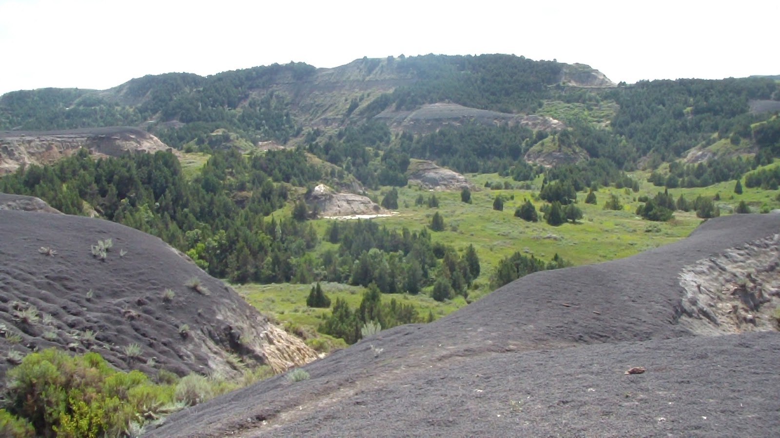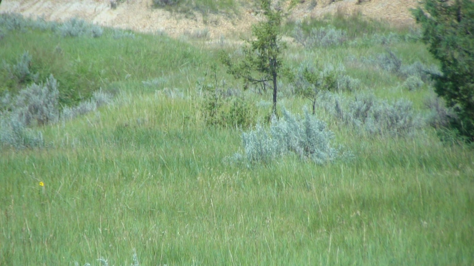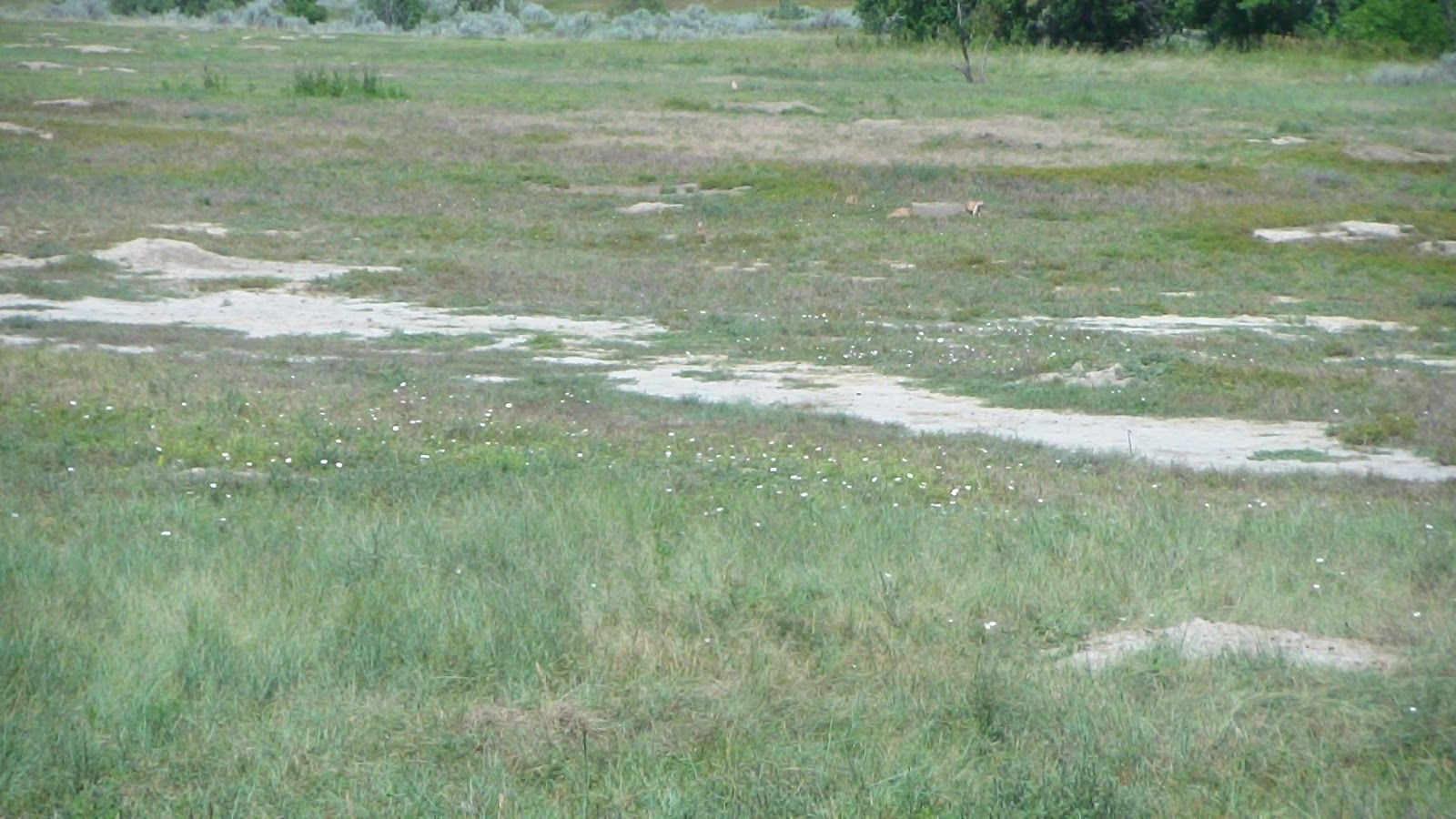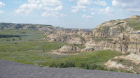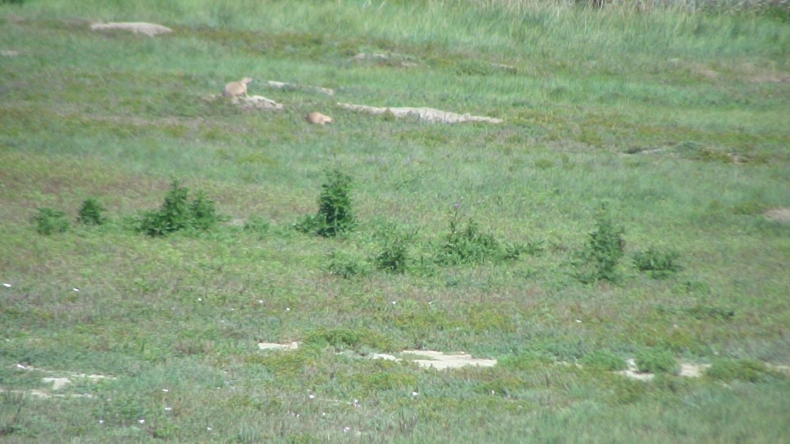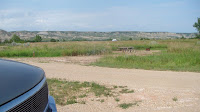 What a ride! It must be said that the most memorable rides aren’t necessary the most fun rides, and today was certainly a case in point. Today was a day of many firsts, several losses, lots of close calls and countless spectacular views. We began by entering the National Park and driving down to the parking area across from the entrance to the campground, where there was a trailhead to the Buckhorn Trail, our trail for the day. After quickly saddling up, we headed across grassland, doing our best to follow the trail, but there seemed to be countless variations, and no sure direction. We made our way until a marker, essentially a post in the ground with an unreadable plate on it, so we figured we must be going the right way. I had brought my GPS and created a map of the trail, but in several places, the hard copy map which I had overlaid on Google Earth didn’t completely match the red trail markers already placed on Google Earth, so I split the difference on my GPS map. As time went on, though, it seemed some sections of the trail were a moving target. Anyway, we made our first small climb, a ravine about 20 feet high, the first of many we were to make today. As we crossed the grasslands, we were faced with many small ravines, steeper and deeper than a simple creek crossing, and probably narrow enough for a hunter to jump over, but we aren’t riding hunters so we had to persuade our horses to essentially drop into a pit and climb back out again. Just as they were starting to get used to that, we came to another deep ravine, this one probably 15-18 feet deep, down and up. Just as we got to the top, and I was just getting Apollo ready to head down, suddenly his head went up, his nose flared and he snorted in defense mode, because about 20 yards beyond the top of the opposite side of the ravine was a great big buffalo. Even though he had mostly gotten over his anxiety about cows, apparently a buffalo is a completely different matter. Needless to say, Apollo wheeled around, wanting no part of it, and Clio followed suit. We spent the next 15-20 minutes trying to settle them down, though they were truly in flight mode. We tried to find another way around, but there wasn’t one. After staring at the buffalo for some time, they eventually weren’t quite so frantic (the buffalo was ignoring them completely), they got a tad bit quieter. Fortunately, the buffalo started moving away a bit, down into another hollow, and laid down, so it could no longer be seen by the horses (though obviously the smell was still strong). I managed to persuade Apollo to go back to the top of the ravine, but I still couldn’t get him down it, so, as a last resort, I got off and walked him down the ravine. He seemed a bit more calm because I was ignoring the buffalo, which helped, but of course, he was too anxious for me to get back on him, so I had to lead him up the ravine. Naturally, he ran past me and practically dragged me to the top, it was fortunate my Mccarty lead was just long enough not to throw him off balance, as it was a considerable drop had he done so. Anyway, I climbed to the top and started walking past where the buffalo had been (and still was, just off the trail a bit more than previously), and Hubby and Clio crossed the ravine with no problem, as usual when we lead the way. I continued to walk for another 100 feet or so, enough to get Apollo settled down, and finally remounted and continued along the trail. More grasslands, more steep little arroyos, more uncertainty about which way the trail went, since the markers were few and far between, and there were uncounted trails made by the buffalo here. We finally came across a marker and headed for it, only to discover that just beyond that, and along the trail where we were headed, was a whole herd of buffalo! Granted, it was a small herd, but a herd is a lot more imposing that a single buffalo, and there were young one’s around for the bulls to protect, so we had to be extra careful. Fortunately, they seemed to be heading away from the intersection (and away from a hiker that evidently was trying to get closer to them), and that emboldened Apollo a bit (bravest coward I know, besides my little dog Billy), he was tossing his head at them as if to say, “So there! I’m not afraid of you anymore!” Of course, that lasted until the herd saw us, and, like the cows last week, turned around and headed for us, apparently just out of curiosity. We headed away from them as best we could, but we were going in the opposite direction that we wanted so we just went far enough so that the herd lost interest for the time being. We tried to get around them, but they just come toward us, but eventually they just started heading down the trail where we wanted to go, so we hung back and slowly followed them, stopping every time the bull in the rear turned to look at us, then starting up again when they resumed their progress. Eventually, the plain widened out enough, and the horses had settled down enough, so that we could give them a wide berth and walk around them. It’s a good thing the buffalo walk so slow, it made it possible to get around them at a walk. Whew! What an experience! By the time we passed the herd, the horses had apparently gotten over most of their fear, so this was a big step for them today! Shortly thereafter, we arrived at the Prairie Dog Town, a wide area full of low growth and scores of little heads and wagging tails and lots of holes to avoid. We observed them for a while, very cute and cuddly looking, and the horses only gave them a cursory look, thank goodness. We stayed on grassy plains for a while, and just as we were leaving the Prairie Dog Town, we saw a good size fox loping away from us, apparently disturbing his hunt, though I can’t imagine it would be that difficult to get a meal of prairie dog, considering how many of them there were. We continued along reaching another steep arroyo, and just as we were approaching, the he