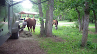 Not surprisingly, getting out of bed was a slow process : -). The horses seemed no worse for the wear today, and we weren’t as sore as we thought we would be (thank heavens for tylenol and ibuprofen!), so we rested most of the day, except I spent a little time working on the drapes I started back in May at home. Lots of folks coming in during the day, as there is a 100 mile bike race starting here tomorrow morning (at about 4:00 am, apparently), so tents are going out all around us. A quiet bunch, though, very serious, so the day was uneventful (thankfully!)