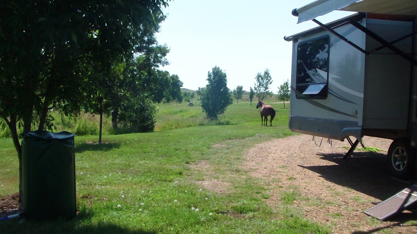 Set the alarm for a slightly later start, knowing the office wouldn’t likely be open until 9:00, grabbed a liquid breakfast and left right on time, having had to empty the rain barrel (so much water-and time-wasted here!) before getting the horses back in the trailer. Got to the office just after they opened, got a refund for the three days we won’t be here, then headed back to nearby Fergus Falls, where we did some shopping at the local Farm and Fleet (the Midwest Farmers version of a multi-department store that has everything except groceries for humans!) to pick up more horse feed as well as a few other things we needed, filled up with gas, made a quick sandwich in the RV (half of mine I dropped when someone startled me coming out of the RV door), then headed out to Hankinson Hills in North Dakota. We both sighed with relief when we crossed the Red River out of Minnesota, SO glad to be out of that very unfriendly state. It’s amazing, it only took half a week to drop like a stone on my list of favorite states, and after just a few hours on another day, down to the absolute bottom of my list, just slightly lower than Massachussetts, which had previously been my least favorite state. Following Google Maps Navigation on my phone, which thankfully had a signal all the way, and several miles on a gravel road, we arrived at the campground. Two loops, one livestock friendly, the other just for campers, we soon picked out a perfect site, nestled in the trees, with a good view for the satellite signal, perfect trees for highlining, lots of open space for grazing, just one other horse camper site taken, though no horses in their corral, so they were obviously out for a ride. Hubby checked the water supply, the hand pump in the horse area was a lever type, and in the regular campground there was a wheel-like pump we’d never seen before, you just crank it like an ice cream machine and water comes out of the hose pipe. Since it had a spigot, we chose to fill up the rain barrel that way, so after putting the horses on their anchors to graze, we took the rain barrel over in the horse trailer and cranked away! We tried to use a drill on it (which would have been really helpful!), but couldn’t get it to work, but the water came out pretty well, and is less than half an hour the barrel was full. I very carefully drove back to our site, without spilling hardly a drop, and proceeded to get settled in. Though Hubby got the satellite dish set up, something went wrong with the receiver, and the only support Dish could give us was to offer to send us a new receiver. Question is, to where? Good question, one I can’t answer at the moment, so I let it go. Over 200 hours of recorded movies and TV, gone. Disappointing, considering the unit is less than 6 months old, but sometimes going over rough roads is hard on electronics, and we haven’t done as good a job surrounding this one with cushioning like we had in our old RV, so I guess we share in the blame. I’ll do some research as to the nearest UPS distribution center, or at least along the way to our next destination, then decide what to do. Meanwhile, we pulled out an old stack of backup DVDs we keep just in case, watched most of a thriller, though I went out for awhile to watch the stars come out, and saw two shooting stars and a satellite pass by! Not the ISS (according to their website the timing wasn’t right), but definitely something, though oddly, rather than getting brighter as it went west, like the ISS usually does, it faded out. Not sure why, but I’m sure there’s a good explanation. Anyway, it’s very quiet here except for the occasional train whistle and vehicle coming down the road next to the campground, and the temps are dropping, so we’re looking forward to an excellent (and more relaxed!) night’s sleep!