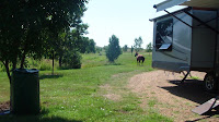Headed out early, stopping at the dump to do a good flush of the tanks, then headed west, by-passing the Twin Cities, only stopping for fuel, lunch at BK and again for Walmart before heading north the Maplewood. It was a fairly easy drive, so we managed to arrive around 3:00. Stopped at the office to get checked in, and then the trouble started again. At first, I was pleased that the woman there said she would assign us a spot, and if we didn’t like it we could simply call her and she’d move us over in the computer, saving me a trip back to the office (something the other camp wouldn’t let us do), but then she asked about vehicle passes, which I told her we had purchased at the last place. She said she couldn’t see it on my windshield and I told her it was laying on the dash in the right-hand corner where they wanted it, and that I could bring it in and show it to her, but she said, no, it had to be stuck on the windshield. I looked at her amusedly, then went out, took off half of the backing and stuck it on the windshield (I wanted to be able to get it off as soon as possible, and sticking only half on would make that possible,) and walked back inside. She said, no, it had to be fully stuck on the windshield. I explained that we were on our way out of the state, and that I wanted to be able to take the sticker off easily, and she said if I didn’t stick it fully on the windshield she’d have to charge me for another vehicle pass! It’s amazing, as soon as you present certain government workers with logic and reason that disagrees with their rules, they immediately resort to bullying and intimidation with threats of fines. That seems to be the entrenched mindset here in Minnesota, and frankly, I’d had enough! Unfortunately, it was too late in the day to find an alternative, so I went back out, finished sticking the sticker to my windshield, paid my $80 for four nights, and was about to leave when she asked me if we had our Horse Passes. I told her I thought that was covered in the camping fee, as the last place hadn’t asked us that, and she said, no, it was a separate fee, $5 per person per day, or $30 per person for an annual pass! I told her I didn’t know if we were even going to be riding, and she told me to come back and get one before we rode. I was seething again by the time I got back into my truck. I radioed Hubby and told him what happened, and we made our way to the campground, which was rounded hills throughout, with hardly a level spot to be found. While he went looking for a spot, I started to fill up the RV fresh water tank from the one and only spigot in the camp, about 20 yards off the road, but with no pullout, so I was essentially blocking the road the whole time. A couple of women day riders came by and we had an informative chat about the trails, and the park, and some other parks. They were formerly from southern Illinois, so we had some camps in common (Garden of the Gods), but they also expressed frustration about needing Horse Passes just to ride the trails. I asked them to stop by on their way back, to talk more about what was in the Dakotas, and they agreed before heading on their way. Hubby finally found a spot that would suit him for a satellite signal and radioed to tell me where. I finished filling the RV and turned to filling the portable rain barrel, which I only had room to put on the tailgate of the truck since we had such a full load of hay. I tied a rope around it to keep it from moving, which would have worked fine if the roads and/or sites had been level. After spending nearly an hour filling up, I finally headed down to the site Hubby had chosen, which was tucked away mostly in woods, though clear to the southwest for his satellite. Unfortunately, it was a reverse uphill climb for me, and halfway up, my rain barrel lost it’s balance and tipped over, ripping a seam along the top zipper in the process, and completing emptying out, darn it! It’s amazing, once we are confronted with negativity, it just seems to compound itself, and more things always seem to go wrong! Anyway, we finally got the RV settled in, then I had to take the rain barrel in the back of the horse trailer (they were on their anchors by now, grazing), and went back to the spigot and spend another 20 minutes filling that up again. By the time I got back it was after five, and Hubby had decided not to bother with the satellite dish tonight as it was so late. We both commiserated on yet another bad Minnesota/State Park experience, and after some discussion and research, decided that $20/night was WAY too much for a spot that wasn’t level, water that wasn’t accessible, no electricity (which for $20 a night most places would have), plus the requirement to spend yet ANOTHER $10 just to ride the trails, or risk being caught without a pass and being cited for that. Oh, I forgot to mention that just after we arrived at the campground, a ranger showed up, ostensibly to help us choose a site, but it quickly became obvious he just wanted to make sure we had stopped at the office and paid all our fees. Anyway, we decided we would both be miserable under these circumstances (the only thing this place had going for it was at least it had highlines rather than hitching rails), so we determined that we would move again tomorrow, this time to Hankinson Hills Campground in a small section of the Sheyenne National Forest about 80 miles from here. It’s only $6 a night, with 50% off for Hubby’s Golden Age Passport bringing that down to $3 a night, it has two water outlets, albeit hand-pumps, but since the RV was full anyway, all we’d need it for is the horses. I haven’t been able to find a trail map, but apparently there’s at least an 8-mile loop around the park, and it’s small enough where it doesn’t look like we could get lost, and the Google Earth shot makes it seem like there are a number of other trails that crisscross the main trail, so it should be interesting