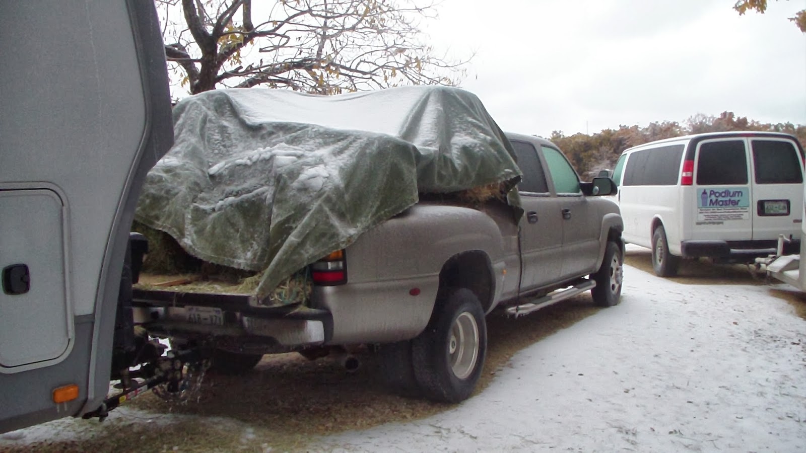 So, one of the reasons we decided to spend the late Fall and early winter in Texas (besides visiting family in Austin during the upcoming holidays) was that the average temperatures for December here supposed to be around 63 during the day and lows of 40’s overnight. Last night, it got down in the 20s, and we had rain, sleet, ice, and by this morning, snow on the ground! We were stunned to wake up several times during the night to the sound of thunder! Can’t remember ever hearing thunder when the temperatures are so cold. Have you every experiences thundersnow?? Weird. Everything was covered with a layer of ice, couldn’t get the truck door open, Hubby had trouble getting the tack room door open, he needed a tool to do it. The tarps we had put up on the corral had become a solid sheet of ice, and unfortunately, the wind had blown a lot of rain into Clio’s stall, so we moved here and Apollo over to drier stalls. We’re not too worried about anyone else coming in to ride today… We’re a bit worried about one tree that hangs directly over us that looks pretty dead, and if it gets a lot of weight on it, might come crashing down, but we’re keeping our fingers crosses that doesn’t happen! Highs today to stay around freezing, and more cold all weekend, with, what the NOAA calls, a “wintry mix.” Not quite what we signed up for, but then again, we’ve been pretty fortunate with the weather mostly this year. Gotta say, though, Florida’s looking mighty fine right now… : -). Too bad we decided to winter in Arizona starting in January, even there it’s extra cold so far this year. Hope things improve as the winter goes on!