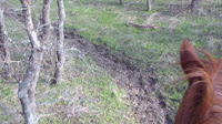 At last, the temps are warm enough for an enjoyable, un-bundled ride! We had been awakened early by our neighbor leaving, (they began packing up about 6:00, before the sun came up, and finally drove off about 7:30), but stayed in bed, sleeping off and on until about 9:30 before getting up and starting our chores. After breakfast, we headed out to saddle the horses, and saw that another day trailer had come in and were saddling up as well. They were gone by the time we finished, and we left shortly thereafter. As I feared, Apollo was like a stick of dynamite, looking for any excuse to blow up. Before going very far, I got down and tried to lunge him with my Mccarty line in an effort to blow off some steam, but he wasn’t into it, so I got back on and we took a side trail in an effort to get his mind on the job at hand. He did okay, but still was bundled up. He finally burst out on a muddy crossing, and I had to get down and run him around a bit, twice in about a quarter mile. Finally, when we had a choice between a side trail and a straight utility line road, I elected for the latter, figuring I just needed to walk him until he settled down, and that what we did. It must have been close to two miles of walking, but he finally started to drop his head and calm down a bit, enough for me to trust him at a jog. Thankfully, Hubby did a great job of keeping mama Clio behind us, until Apollo was calm enough for her to step up to a trot and pass us, and we soon burned some excess energy with a long trot and even a short, controlled canter. The trails here are mostly grass, but with all the rain there were a few muddy spots. Mostly they were utility lines and trails that bordered fallow fields, but we finally accidentally happened onto the blue trail, which followed a Texas-sized creek (we presume the Waxahachie) for a while, and was very nice, more like what we prefer, before joining back up on the red trail which was a straight road. Eventually, we found the green trail, which, like the blue trail, was more to a liking. By this time, Apollo was back to his normal self, and I was able to relax and really start to enjoy the ride. A nice trot and even a little canter as we headed home, finally wearing off that extra energy. All told, it was about 7.5 miles and we were out almost 4 hours, perfect for what we needed to do. Can’t say the trails are really attractive, but they certainly served the purpose today. After multiple premonitions about ending up on the ground on my butt, I took every precaution to avoid that, it succeeded, yeah! Settled down for the evening, even deciding to have a cocktail, in order to use up some orange juice someone brought us over a week ago. Good excuse, right? : -)