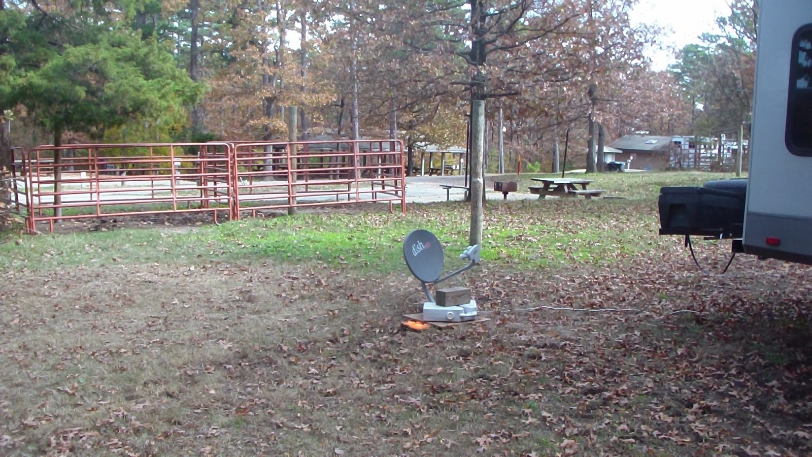 Up extra early so because we have a long drive today, trying to get south before too much cold weeather moves down. Fought a heavy headwind the whole way, using up almot 30% more fuel than usual! Grabbed an egg sandwich at a truck stop next to the freeway, as there were no other restaurants for a long time on our backwoods route. Stopped at Tractor Supply and Walmart before arriving at camp. Despite the office telling me the camp was empty, there were at least a dozen sites taken by other campers, so we had quite a challenge finding a spot long enough. Frankly, this is one of the dumber layouts we’ve seen, with most of the sites at a 90 degree angle to the road, rather than a useful slant, which means very sharp turns, lots of opportunities to knock over posts on both sides of the road, and they idiotically put large rocks along the edge of the road, reducing room to maneuver. Most of the sites are pretty short, and it took us a couple of tries to find one that was actually long enough, and that left room for the horse trailer. They have half a dozen “triple” sites, which is three parking spaces right side by side, which, if used according to design, would leave no room to put out an awning, in fact, almost no room to open your trailer door, much less provide actual “yard” space. We finally managed to get in, put the horses in their corral and got everyone else settled in just before dark. These corrals are the kind that simply “pin” together, so they rattle like crazy, especially when you hang a feed bag on them and the pull at it on every bite, so it was kind of noisy out there all evening. We were both bushed from the long day of fighting the wind, but Hubby still managed to get the satellite dish up and running before we settled in for the evening.