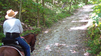 Because of weather forecasts that don’t look promising for the next few days, we decided to take advantage of nice weather today and go for our first ride. I plotted out a route that was supposed to be about 6 miles, but lately I’ve begun to think my Google Earth maps are just not quite accurate. We looped around toward the north, under a bridge and across a fabulous variety of terrain, from open fields to narrow woods trails winding through forest, up and down some pretty serious inclines, several creeks crossings (one was quite deep, though we skirted around the edge instead so we wouldn’t be swimming-I heard later that it’s about belly deep) and generally a beautiful ride. Stopped once at a ranger station to see if a package from Valley Vet had arrived yet (I had ordered it over the weekend, but the UPS tracking trace said it was supposed to arrive today!), but the office was closed. The ride ended up being 10 miles, though, so by the end, Hubby’s back was hurting him and he wasn’t enjoying himself the last hour or so. Too much going down steep descents. We got the horses settled in, Hubby took some Tylenol, and we settled in for dinner and TV for the night.