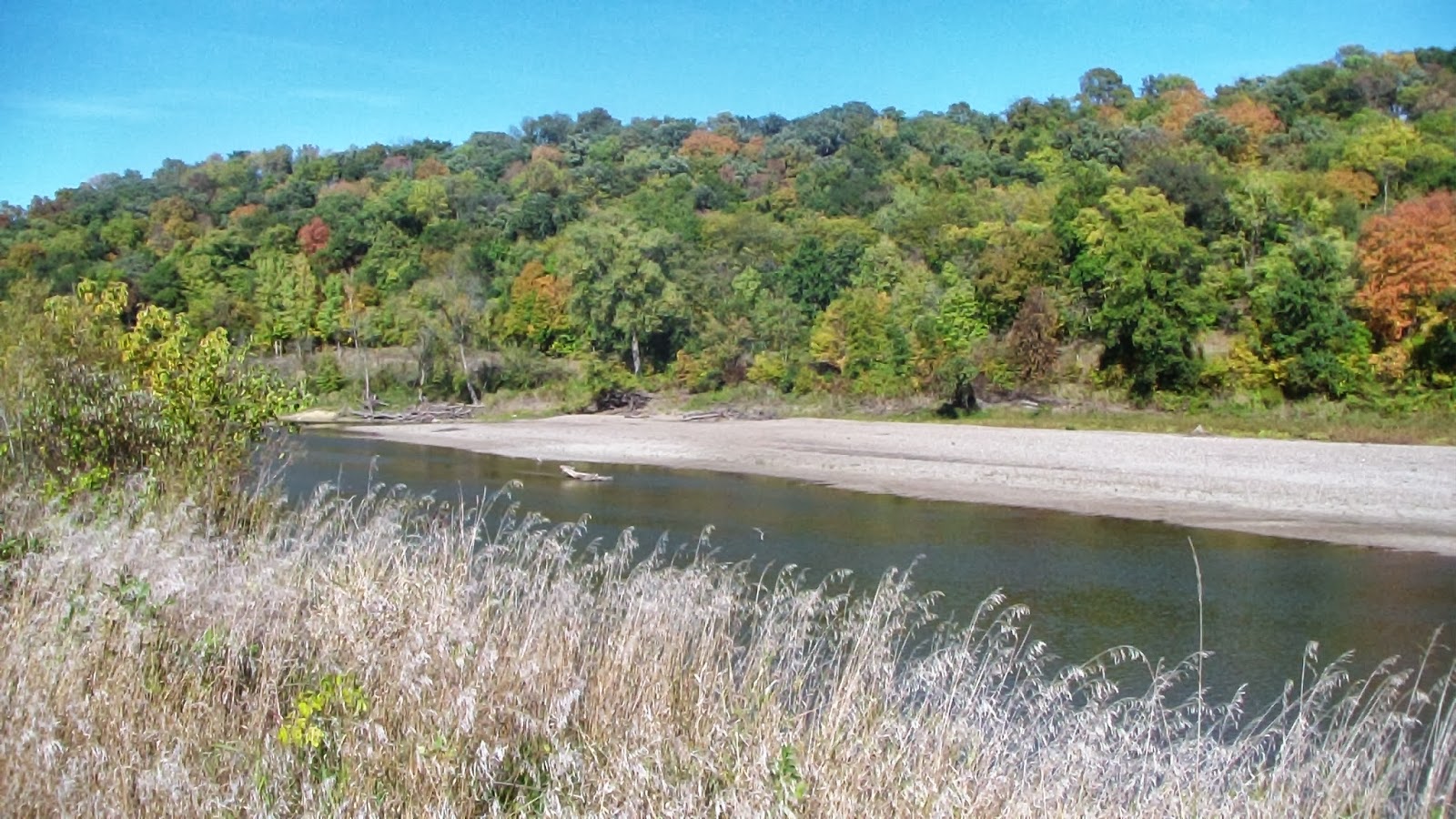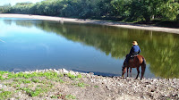 Well, today we truly discovered why this is such a popular horse camp in the Midwest, why everyone always asks me if we’ve been here. One guy last week told me he could live at Brushy Creek! I’m not sure I’d go that far, but I can certainly see spending several weeks here. I got up just in time to finish making manure piles, because here at Brushy Creek, men actually come around with a skiff and shovels and pick up after you! Never had THAT before, at least not without having to first wheelbarrow it over to a central bin somewhere! Here they actually come looking for piles, though they missed one of mine, so I guess they’ll get it next week after we’re gone. Anyway, after brunch we saddled up, again with our new bitless bridles, and headed out of camp on the opposite trailhead from last week. At first we thought we might have to trailer them down to the Lake Trail near the north equine camp, since we had had so much rain yesterday we thought they would closed the non all-weather trails, but in fact, we were told they were open, so we left straight from camp. The first section was a bit slippery, particularly on a few rather steep grades, but before long the trail started drying out a bit, and there were many sections that were more out in the open that had had a chance to dry. We had some fantastic canters across several fields pretty early on, which the horses seemed to love! Apollo seems much more comfortable in his new bridle, his transitions were much more gentle and smooth. We took the SW River Loop, staying on the outer perimeter, and the majority of the trail followed along the curving river bed, with several places to stop and water the horses. It was so beautiful! The trees are just starting to turn, and the river was so peaceful, it made for some beautiful pictures today! We did a lot of trotting and cantering, whenever the trail wasn’t too slippery, so even though we covered over ten miles, it only took us less than 3 hours. Apollo was perfect until very near the end, when we ran into a couple of cowboys galloping across a field, then he did one quick rodeo (probably just to show off, though they were out of sight by then), but otherwise everything was just perfect. A gorgeous ride in a gorgeous place! Thanks, Iowa!
