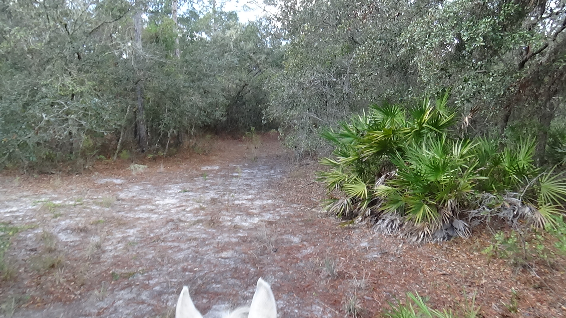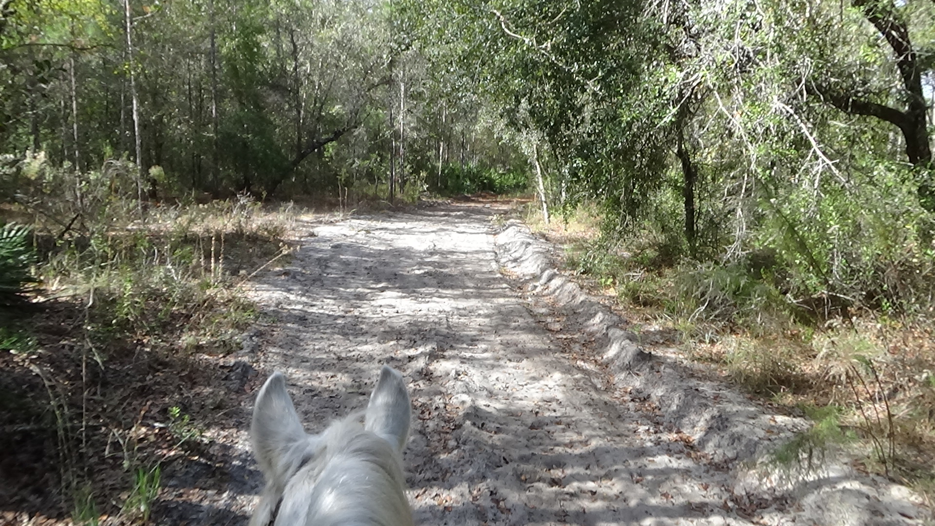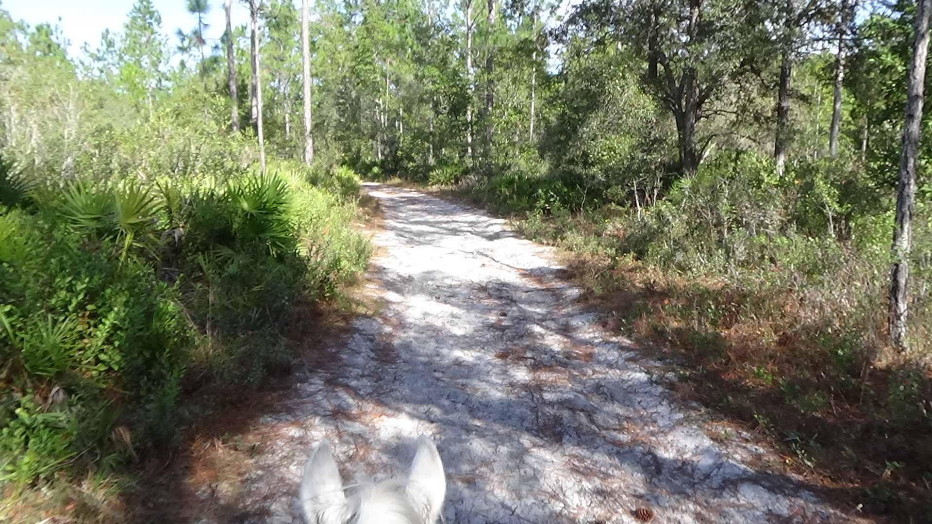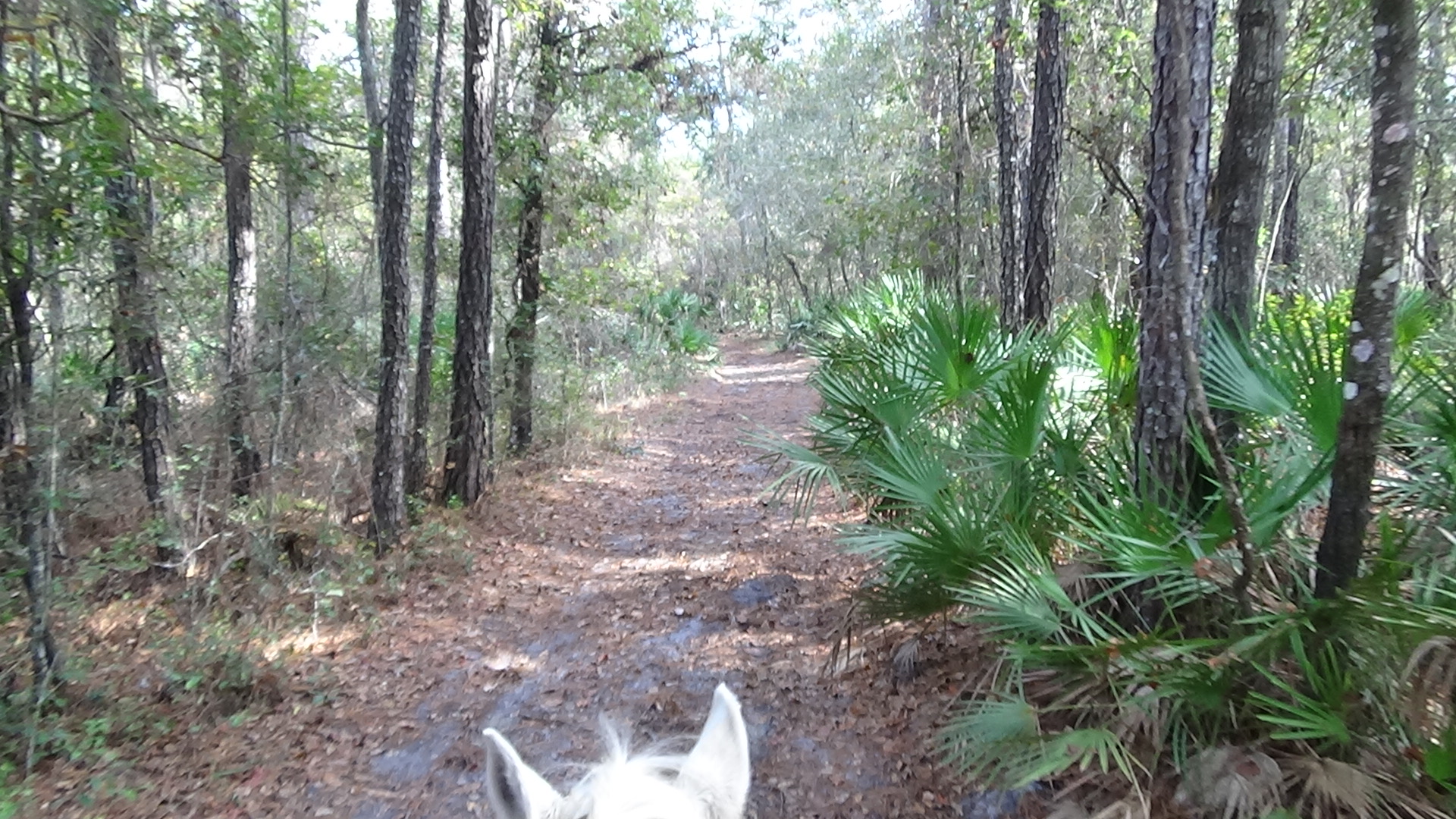What a great day! It started out with a much better night sleep, confirming my supposition that it was the overdose of aspertame that was preventing me from sleeping well. I had none of the previous afflictions after resuming a mostly water beverage diet today. After breakfast I had to fill up the water in my truck tank and refill the camper, then I finally saddled up Flash and headed out on the trail. We took the long perimeter trail, crossing 441 and riding all the way up to O'Leno State Park. I'd forgotten how beautiful it was on this side of the forest! Flash was brilliant once again, averaging nearly six mph for the day. We did over 14 miles in just under three hours, and got a tremendous amount of galloping, cantering and gaiting in. It was wonderful! About halfway around we went by a cattle or dairy farm, and we were sorry to see a dead cow in a copse of trees, and another cow, still alive, but laying down and not looking very well. So sad! Not far out from camp, there was a long rattlesnake crossing the trail in front of us, and when I stopped to take a picture, it started to rattle and curl up, so we moved along quickly to get past it. What a truly gorgeous ride! The weather is due to turn colder, so I wanted to get a good ride in before that happened, and I couldn't have asked for a better day, or a better horse. Flash truly is a wonder! Gave him a good rinse off with a brush before putting him away, and was happy that he didn't immediately roll in the dust, as he is wont to do. Settled down for the rest of the day to reading and bingeing on TV, and am looking forward to a quiet day for Thanksgiving tomorrow. Good night, my darlin'! Love you!