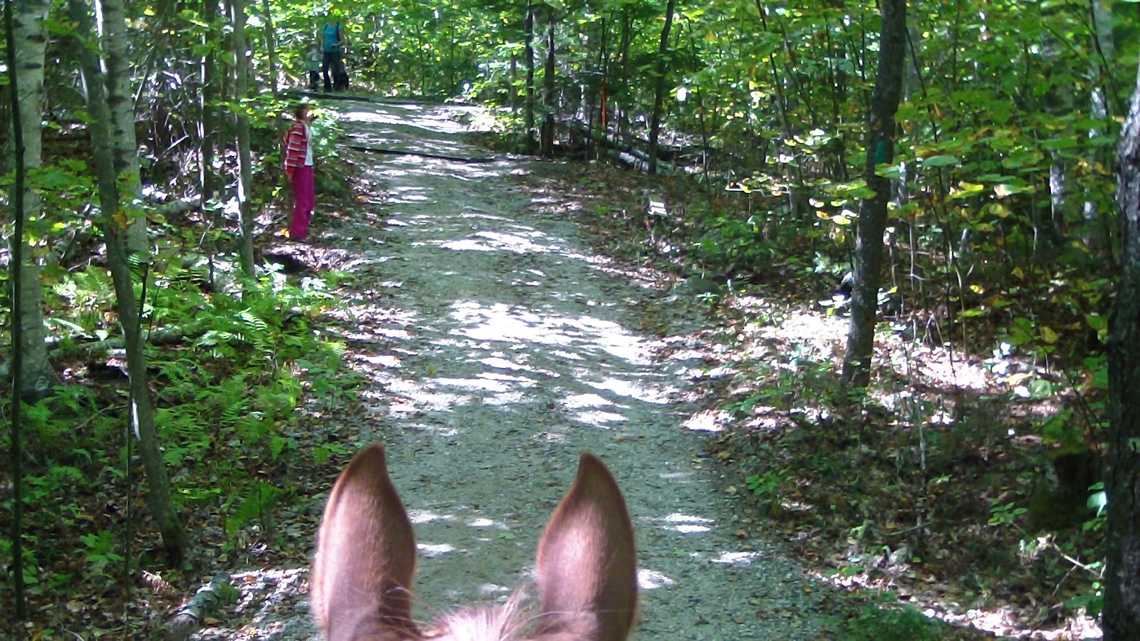 Headed out about 1:00, crossing the road to the West Side trails. We thought they would be busy yesterday (and they probably were), but it was still very crowded today. Haven’t seen a trail with this many people on it since the Grand Canyon! Lots of hikers and a few bikers, with many of them stopping to admire the horses. We followed the well-marked trails in a figure 8, along trails with mostly a large rock and pine root surface until we reach the top of Bradbury mountain, where it opened up on to a large, relatively flat rock area that was covered with people sitting on blankets, walking around and socializing, eating picnic lunches, and just generally it looked like a day at the beach! Never seen anything like it! A very jovial atmosphere, though, and naturally, every kid around wanted to come and pet the horses. Hubby and I took turns walking down to see the view and entertaining the kids and their parents, staying more than half an hour there at the top, which was a nice way to fill in the day of what would otherwise would have been a pretty short ride. The view was spectacular, the trees just starting to change, and way, way, way off in the distance you could see the ocean, though I had to put my camera on superzoom to get it, and wasn’t really sure about it until I looked the pix later in the evening. Beautiful! Eventually we headed back down the mountain and back to the campground, only getting a few short chances to trot because of the rough pine root surface, but it was a lovely ride on a perfect day or sunshine and moderate temps, exactly the kind of day for which we are always searching!