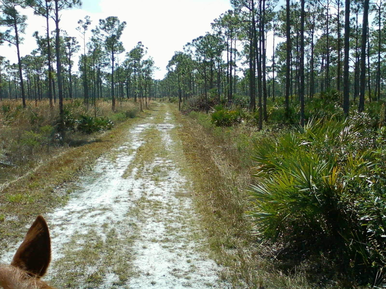 After a few uneventful work days, we loaded up the horses in the trailer and set off on the 20 minute drive to Jonathan Dickinson State Park, just off the beach north of Jupiter. We paid the $6.00 entrance fee, got a trail map and headed down to the equestrian area. There were quite a few cars parked there, but none with horse trailers, so it looked like we would be on our own. It was a beautiful day, unseasonably hot (better than unseasonably cold!), but there was a nice breeze coming from the beach that cooled it down a bit, still making it in the upper 70’s. Trails (well, actually, roads) were very well marked, mostly sand and grass so the footing was excellent. Lots of long straight-aways for trots and canters, though Hubby’s mare isn’t too keen on cantering when the weather is this warm, but she has a fast trot that’s about equal to my gelding’s lope anyway. Extremely easy, level trails, so they did get a little boring after a while, though it’s never too boring not to be enjoyable! Mostly widely spaced tall pines and scrub palms covering the terrain. Took the red perimeter trail, then weaved around a couple of the inner trails just to keep it interesting. Rode about 2 ½ hours or so before packing up and coming home. A beautiful day, just the kind of thing we were looking forward to here in Florida!