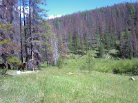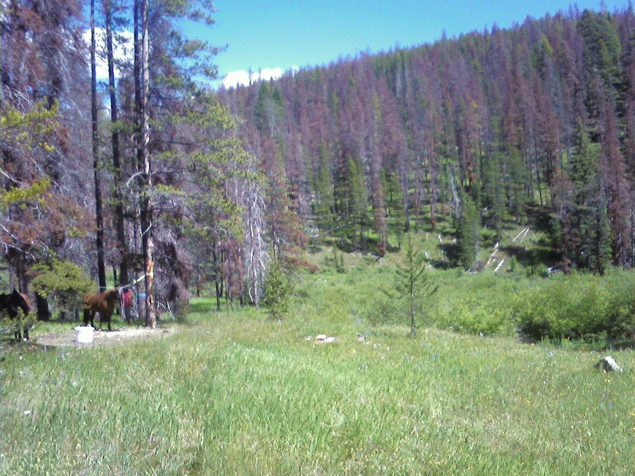 We had so much to do today, and so far to go, we set the alarm for 6:15, up by 6:30, out by 7:15 with coffee to go.  First stop was the Crosswinds RV store in Pocatello to pick up a new electrical cord we had ordered last week, then a stop for breakfast to go at Burger King on the way back to the freeway, then a quick gas stop just before crossing the border into Montana (high prices, but the only fuel for miles beyond.  They had a wifi signal so I quick checked my email before moving on.  Next stop was to pick up hay from a woman in Dillon, MT.  Her bales were HUGE, so I couldn’t just pay her the $4 a bale she was asking, so I gave her more.  The bales weren’t perfectly green (which, apparently, folks around here expect), but it was fine and fresh and certified weed free, which is good enough for us. That took us almost an hour to load.  Then we headed to Wal-mart in Butte, then a liquor store at a gas station/casino (truly!), then onto a town called Deer Lodge where we picked up water, then finally, on to the Helena National Forest.  Our original plan was to stay at the Kading Campground, which has a horse corral, but discovered they were “closed” for reasons I still can’t comprehend, (though they gave the impression there were trees down, which turned out not to be true), but they said there were many turnouts with the Little Blackfoot River next to them.  As we traveled across 15 miles of gravel road, we saw quite a few turnouts, but most were occupied and many would never be able to accommodate a rig our size.  We decided to go all the way to campground before turning back to look for something.  We arrived at the campground (noticing that the campground looked fine, except the blockade that prevented us from entering), and saw that while there were corrals across the road from the campground, there was no running water, and no creek nearby.  Hubby decided to follow the road to see where it went, and found a turnaround a little ways up, and signaled me to follow and take a look.  We found the trail began at that point, but it seemed large enough to (maybe) get the RV down it to a little clearing next to the creek.  We decided to give it a try.  There was one sharp turn where I ended up dragging the back of the RV, which one of the stabilizers, which will need repairing later.  Ultimately, we made ourselves a nice little camp, though the only way we could get level was to encroach a little on the trail, but there’s room enough to get a pickup truck by, as we discovered later, so no harm done. It was well after 7:30 by the time we got everything settled in, and we were exhausted from all the activity.  Through together some dinner, then crashed!