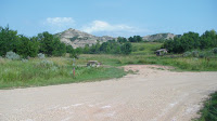 Woke up early to the alarm, knowing that while the trip was relatively short, the errands and stops we had to make would make it a long day, and sure enough, it did. First stop, breakfast at Burger King, next stop, Runnings Farm and Fleet, third stop, Walmart, where I filled up the RV, the horse trailer and BOTH portable barrels, as the only water at the CCC camp at the Little MO Grasslands National Forest was a single hand pump and we planned on staying a week, so we would likely need it all, but I accidentally hooked up the water to the black water flush intake for a while, and by the time I noticed it, the black tank was practically full. Fortunately, at breakfast I noticed that the Cenex gas station next door had an RV dump, so on our way out of town, we stopped there, both to dump and to top off my fuel tank. Unfortunately, Hubby forgot to get gas for the generators, an oversight he didn’t notice until we arrived at the CCC camp, 15 miles from the nearest gas station. We still had enough for the night, though, and once we got settled in, we ran the generator long enough to charge the batteries just fine. The CCC camp is only about a mile off the main highway, 85, but far enough away you can’t hear a thing, but from where we parked (site 4), we can see the road as it crosses the Little Missouri River. Across the river is the Theodore Roosevelt National Park, where we plan to ride once or possibly twice while we’re here. The views all round us are quite spectacular. Two of the three loops allow horses. The containment strategy is pipe hitching posts parallel to one another, making it possible to create decent-sized corrals when you put a couple of strands of rope on each end. Loop A has hitching posts at most of the sites, while Loop C seemed to have them all in tandem at one end of the loop. None of the trees were really suitable for a highline, so we opted to put rope between a couple of the rails and create a corral, one for each horse. Meanwhile, they grazed contentedly on their anchors. Clio had been suffering from weight loss for a while (she still isn’t thrilled about the hay she’s being forced to eat when not on grass, though this last batch seems to be a bit more appealing to her), but now she’s started to fill out nicely, no doubt because of all the natural grazing she’s been doing. In the early evening, it started to rain, and we had a deluge that lasted for more than 4 hours. At one point, when we realized it wasn’t going away any time soon, we decided to put the rain sheets on the horses for the night, so we donned our ponchos (and me my Carlsbad Caverns miner’s hat with flashlight) and headed out, getting them all wrapped up in no time. We also put buckets along the awning and gutters to catch as much rain as possible, to supplement our already pretty abundant supply of water, just in case. Once we got back in and dried off, it wasn’t long before bed was calling!