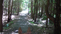 Slept late, got a late start out, but our plan was to just do a short exploratory ride today. We plotted out the shortest possible loop, which was about 5.5 miles, and headed out, expecting sloppy trails after all the rain we had Monday and Tuesday. The beginning actually turned out to be quite nice, a fairly wide forest trail meant for snowmobilers, which climbed for awhile before we came to a fork in the road. Despite the forest folks saying none of the trails were marked (which I didn’t believe, at least for the old trails, those guys ALWAYS blazed it somehow), there were in fact orange trail markers nailed to the trees. I had to get down once and move a tree that had recently fallen across the trail (probably during all the wind and rain), until we came to a fork in the road. We misjudged where we were on the map (the fork wasn’t actually on the map, what else is new?), but we ended up in the right place despite ourselves. Carefully observing the GPS insured we didn’t get too far off course, but once the orange blazes ran out at the first gate (apparently it marked a snowmobile trail with limited access), there were no real clues as to what road or trail we were on. Finally came across a side road/trail that was on the map, but the marker was almost completely buried, Hubby never saw it, and I barely saw it even when I was looking for it. We turned onto what started out as a decent dirt road, but it quickly narrowed into a pretty boggy and stony trail with lots of obstacles. We made it through okay, it eventually became a utility easement following electrical poles, until we finally came out at the back side of the campground. Turned out to be closer to 6.5 miles, but it was still pretty nice most of the way, boggy in some places, but not as bad as it could have been after all the rain. Got the horses settled back in and relaxed the rest of the day.