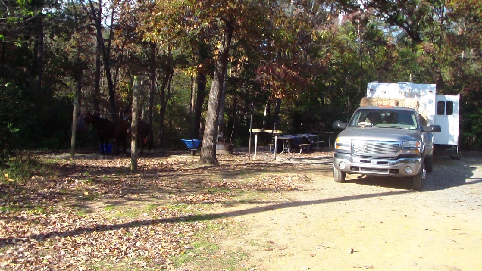 Got off to a little later start than we thought, the atomic alarm clock reset itself to the wrong time, so was 20 minutes off. Otherwise, we got out okay, stopped for gas in Powhatan and breakfast in Farmville, and a quick stop at a Lazyboy gallery to check out a loveseat I had found online. Can’t really decide on comfy furniture unless you actually sit in it, which we did, and found the one we want. Actually a sectional rather than a loveseat, but it has extra storage between the seats that we like. Hopefully we can get that worked out. Carried on toward the Uhwarrie, and made our second to last stop of the day for fuel at a Wilco in Asheboro. That’s when the trouble began. The main sign clearly posted had regular prices in red and diesel prices in green. When I pulled onto the pump, I automatically picked up the green nozzle, because that usually signifies diesel. Unfortunately, at this station, that was not the case. The diesel was actually all by itself in the back (no signage that I could see), but I didn’t notice it until the tank was full. I was just about to get going when Hubby raced out of the store and informed me that I had just filled up with gas, which he had learned from going inside to clear his credit card off. The girl behind the counter explained to him there was no diesel on the aisle where I was. Anyway, what a mess! I wasn’t sure what to do, whether the engine would run on a 2:1 mix (I had about 1/3 of a tank of diesel when I pulled in), but rather than take any chances, I got on my new smartphone and called the nearest GM dealer, which happened to be a GMC/Buick dealer about a mile up the road. After speaking to the service guys I was SO glad I didn’t try to crank it up, because they said if I had, the whole system would have to be cleaned out, but as it stood, if we got it towed, they could drop the tank to drain it, then refill it with diesel and it should be fine. They called us a tow truck, which wasn’t big enough for the job, then while we were waiting for another one, we disconnected the truck from the trailer and pulled it out of the way, then moved the trailer to the back of the gas station, where fortunately there was plenty of room. It wasn’t long before the flatbed showed up, which was still barely big enough to pull the truck onto, with the dually wheels almost hanging off the back end. The full load of hay didn’t help much, either. Finally we headed out, Hubby to run a couple of errands, and me to the dealer to get the job going. The service manager tried to tell me that the job couldn’t be done today, and that we should start making arrangements to spend the night. I, on the other hand, was determined to get it done, and explained to him that I believed in miracles, and would work toward that end. After some discussion with the shop guys, it seems they didn’t have a lift big enough for my truck anyway, so they wouldn’t be able to drop the tank, so it was decided they would try to pump it out with a little hand pump they had but had never used. They gathered a bunch of gas containers and started siphoning, but it took 10 minutes to fill the first tank. As the mechanic went to empty the container, I started pumping instead of just siphoning, and speeded the process up immensely, filling the next tank in just a few minutes. After I filled the next tank, one of the guys took over and started pumping as well, so things started happening a lot faster. Before long, the tank was nearly empty and one of the guys ran out to get diesel to refill the tank. Twenty gallons later, we cranked up the truck, and it seemed to run okay. We let it run while I paid the bill ($200, half for fuel and half for labor, not to mention the $100+ that went down the drain and the $80 for the tow…), but at least we didn’t have any engine damage. Apparently if I had tried to run it, we would have had to completely flush the engine and many be even put in new injectors for $2600 or something. Glad I had the sense to call first! Anyway, by the time that was done, we knew we didn’t have enough time to shop if we wanted to get to camp before pitch dark, so we hurried down to the horse camp at Cane Brake, a place we had come once before but had never ridden in because it rained for three straight days. The camphost put us in a double site that was open until Saturday morning, and we quickly got the horses highlined and us settled in, though the sun was down before we started, so most of it was during twilight. Finally got done around 8:00 before we were able to finish dinner and relax for the rest of the night. At least the truck seemed to run okay on the way down!