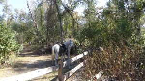 Another beautiful day in here, cool in the morning, mid-70's in the middle of the day. Was out on the trail by just after 9:00 with the same team, marking the orange trail, which was a lot easier because it hadn't been marked before, so we were able to pick and choose our trees. We also didn't make as many marks, we felt there were too many on the other trails, so I measured .15 miles between markers, and that seems to work out just fine. We were actually done just after 11:00, so we headed back to camp, where I promptly saddled up Flash and headed off for our first and overdue ride here. He was ready! We headed out on the blue trail, which I knew would turn out to be the trail along the river, probably the nicest trail out here, and after a nice mile or so of warm up walking, he decided he was in a seven mph mood today, and started gaiting. We went for miles doing that, with occasional canters and walks to balance it off. He was perfect! What a fantastic ride! We ended up doing about 12 miles, and he worked up a lovely sweat. I rinsed him off and put him back in the paddock, where, unsurprisingly, he immediately rolled and covered himself with dirt and sand. Fortunately, it all comes off him pretty quickly, and by the time I fed them their dinner hay and put their blankets on (it's going down to 39 degrees tonight), he was relatively clean again. Settled down for the evening to supper and TV, won't be long out of bed! Good night, baby! Love you!
