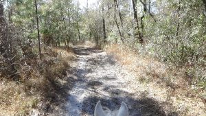 Had a lovely day today! The weather finally warmed up enough for it to be comfortable riding, so after spending some time in the morning trying to figure out how to transfer money for my vacation (STILL not worked out yet!), I saddled up Apollo, put on Lola's orange vest, and away we went! By noon, the campground was empty, so I wasn't worried about Lola on the trail. We went exactly two miles, at an average of 2.1 mph. Lola got way ahead as usual, but did keep coming back to keep us company. We did some lovely trails, though the last bit was along the road. Once we got back, I did a little more work on the computer, then started saddling up Flash for a ride as well. Another camper came in by the time we left, so I left Lola tied up at the trailer. She'd never be able to keep up anyway. Even though we only did about 7.25 miles, we only took an hour and a few minutes, so you can tell, he was really booking! We got lots of cantering practice in today! The only practicing I got on Apollo was my patience! But Flash and I made up for it, speed demon that he is! All cantering and gaiting after the first mile. Gorgeous! Gave him a nice bath afterward, since he had worked up quite a sweat. The trails were all nice today, none were tilled up, and only a few area showed pig sign, so it was a gorgeous ride. Put most everything away before days end, settled down for the night. Quite a few more campers came in during my second ride, evidently ready for the hunt starting tomorrow, but no rangers came around to kick me out, so i guess all is good. Going to try to get to bed early, though I'm under orders to not arrive at the Florida 100 before noon, and it's more than 90 minutes away, so I guess I won't worry about rushing out of here in the morning! Good night, sweetie! Love you!