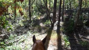 What a fantastic day! Managed to get to bed reasonably early last night, had an excellent night sleep, read for a short while in the morning, then saddled up Flash to take a longer, faster test ride today, to see how his leg really is. He was so full of energy, he was like a different horse! After the first couple of miles as he got warmed up, he suddenly decided he wanted to go, go, go! I don't know if it was the cooler weather, the long layoff, or just that he was feeling frisky, but he insisted on gaiting and cantering for nearly five miles! Considering the trails here are mostly single track, hilly, windy, curvy and right through the forest, it was all I could do to hang on! I can't remember the last time he wanted to move that fast, but it's definitely been awhile. I didn't want to discourage him, he seemed to be having so much fun, and so was I! To make it even better, when I got him back to camp, I kept a careful eye on his weight distribution, and not once did he favor any of his legs. So happy, and relieved! I've got my old horse back. Whoohoo! Rinsed him off, then left him at the trailer for a few minutes while I fixed the gate on his paddock. The top gate screw had come out this morning because the post is rotten in the center, plus it was too high for the bottom bracket to fit into the lower gate screw, so I drilled a new hole farther down so that it would set on the bottom gate screw properly. Once that was done, I put him away, still keeping an eye on him, but there seemed to be no side effects to all his speediness today, thank goodness. So enjoyed myself! After awhile, I got Apollo out and took him for a walk around the camp loop just for exercise, and did the same later with Lola, who didn't bother to come with us the first time. At least I'm getting some walking in these days! Finally settled down for the evening to a new BBC series, Monarch of the Glen, based in Scotland, which is a lot of fun. I had started another fantasy series, Wheel of Time, but it was so violent and gory, I decided to pass on it. Anyway, planning on another early evening, and hopefully another good night sleep, now that the cold front has come through. Back to the perfect weather I always seek, seventies during the day, fifties at night! Loving it! Good night, my darlin'! Love you!