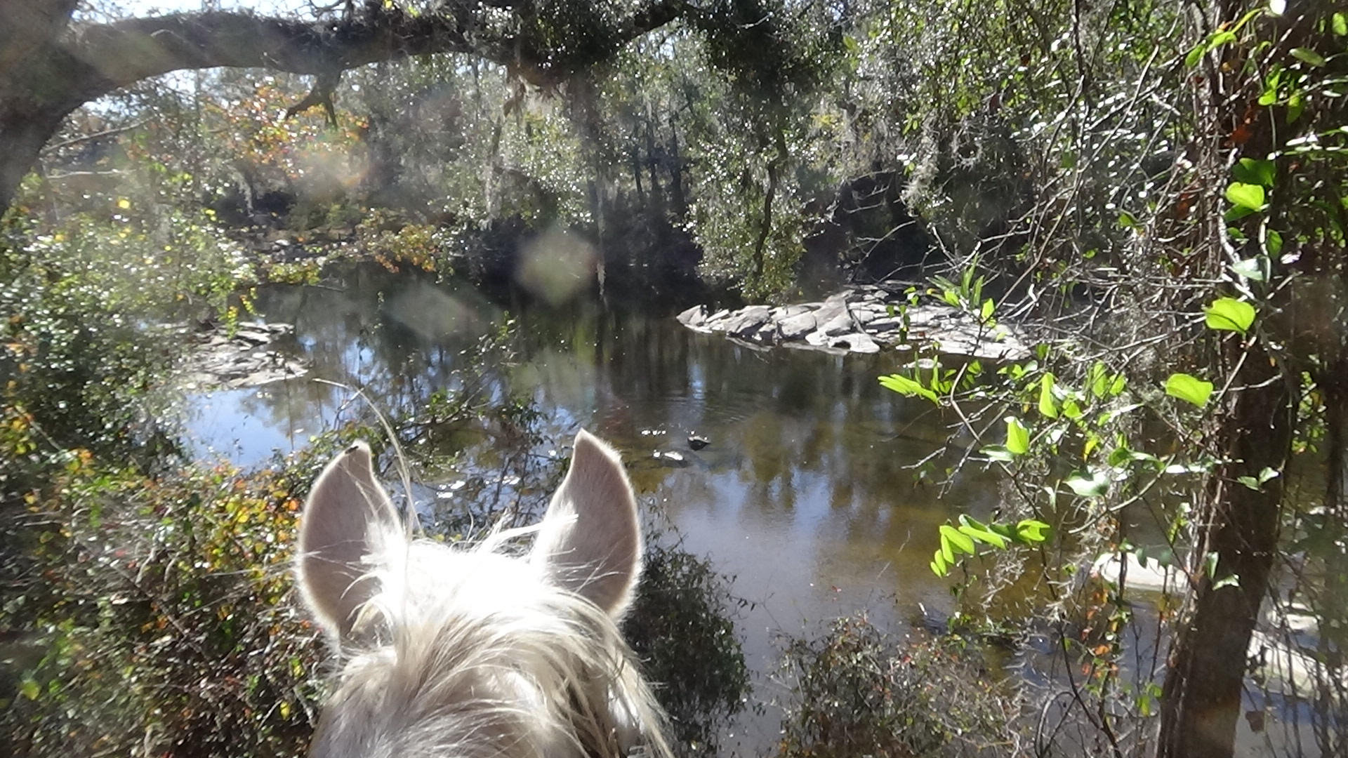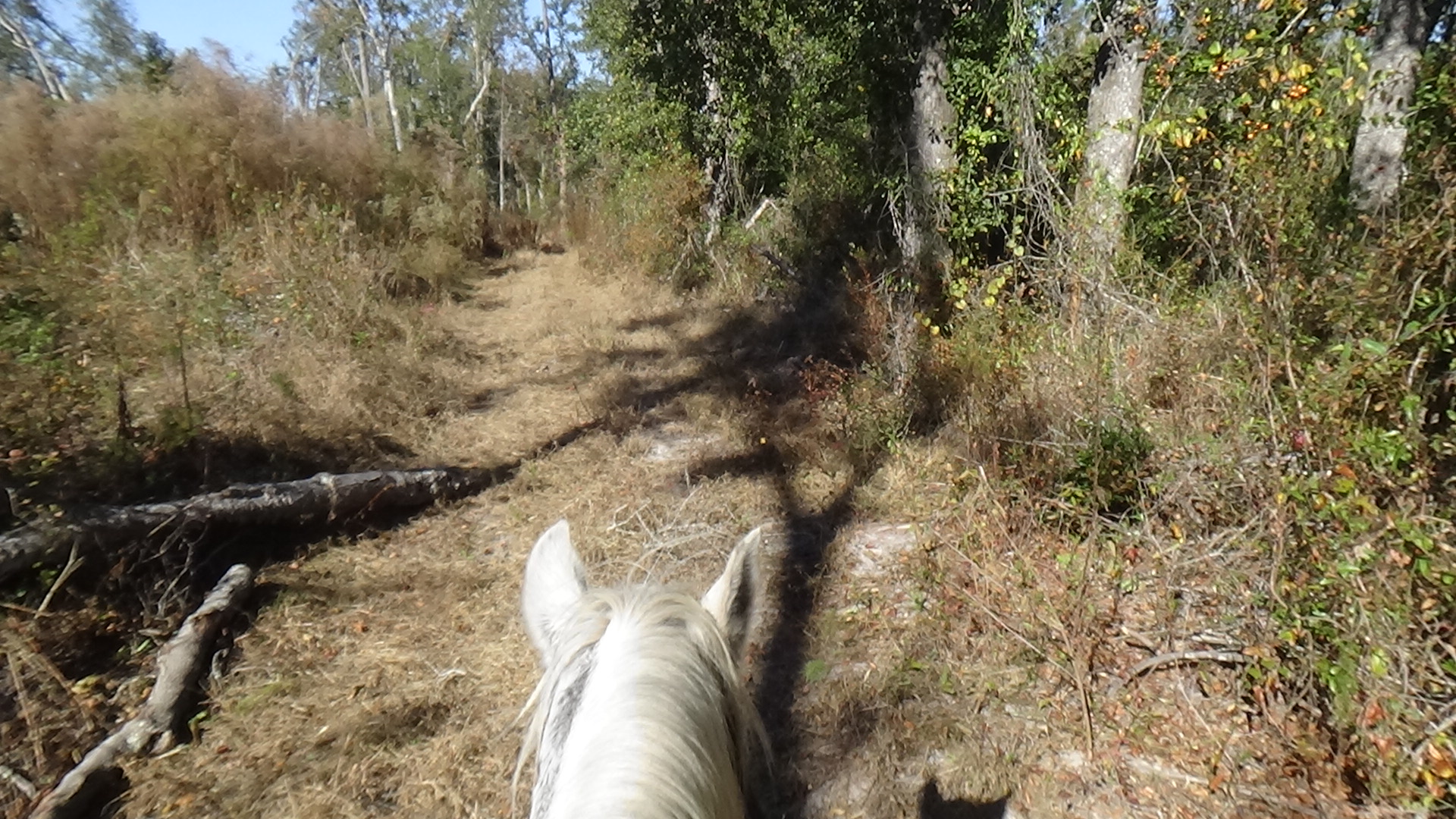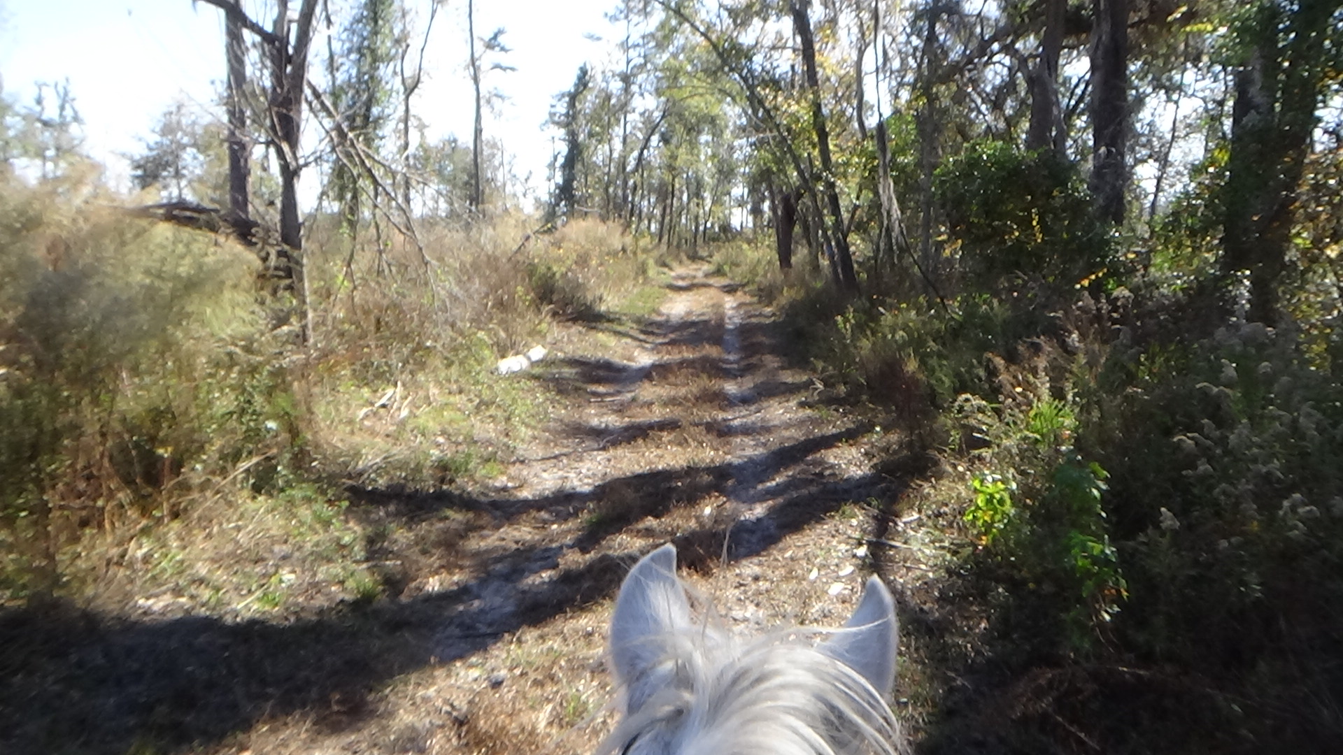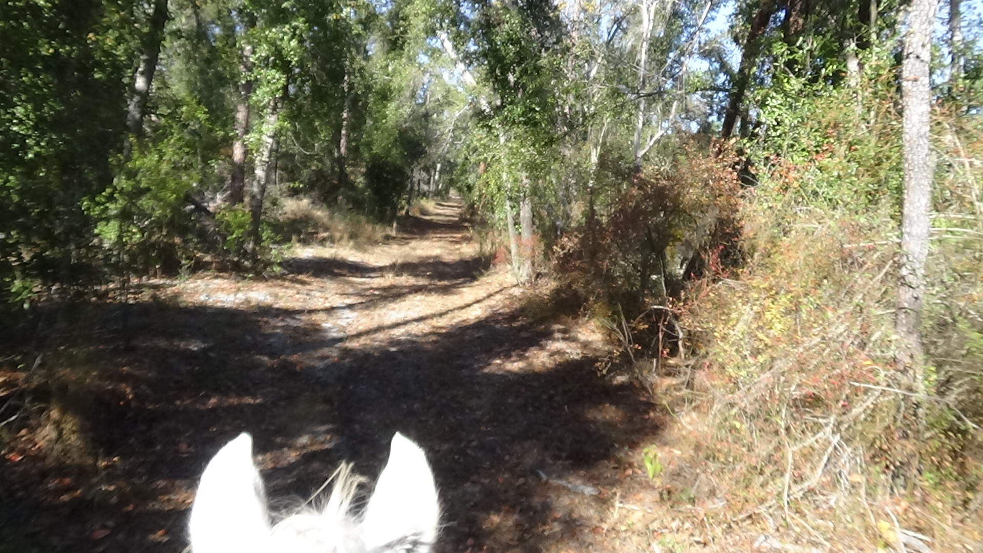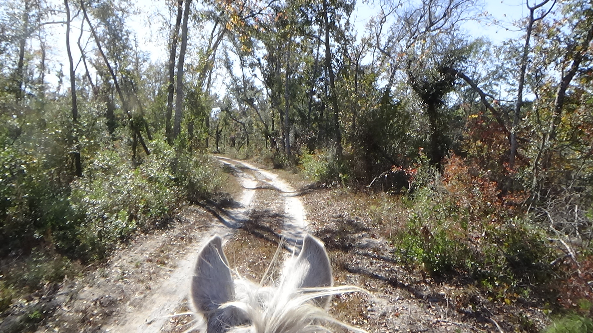 Another beautiful day in here, cool in the morning, mid-70's in the middle of the day. Was out on the trail by just after 9:00 with the same team, marking the orange trail, which was a lot easier because it hadn't been marked before, so we were able to pick and choose our trees. We also didn't make as many marks, we felt there were too many on the other trails, so I measured .15 miles between markers, and that seems to work out just fine. We were actually done just after 11:00, so we headed back to camp, where I promptly saddled up Flash and headed off for our first and overdue ride here. He was ready! We headed out on the blue trail, which I knew would turn out to be the trail along the river, probably the nicest trail out here, and after a nice mile or so of warm up walking, he decided he was in a seven mph mood today, and started gaiting. We went for miles doing that, with occasional canters and walks to balance it off. He was perfect! What a fantastic ride! We ended up doing about 12 miles, and he worked up a lovely sweat. I rinsed him off and put him back in the paddock, where, unsurprisingly, he immediately rolled and covered himself with dirt and sand. Fortunately, it all comes off him pretty quickly, and by the time I fed them their dinner hay and put their blankets on (it's going down to 39 degrees tonight), he was relatively clean again. Settled down for the evening to supper and TV, won't be long out of bed! Good night, baby! Love you!