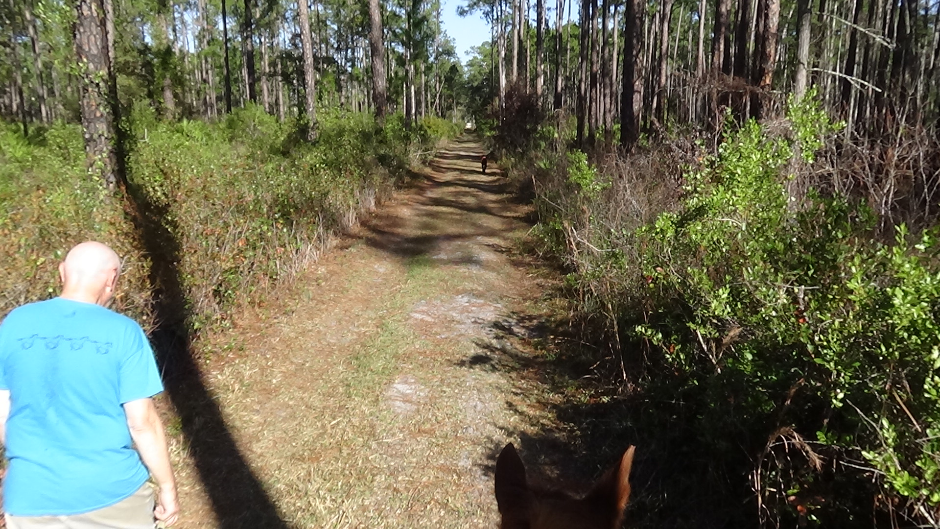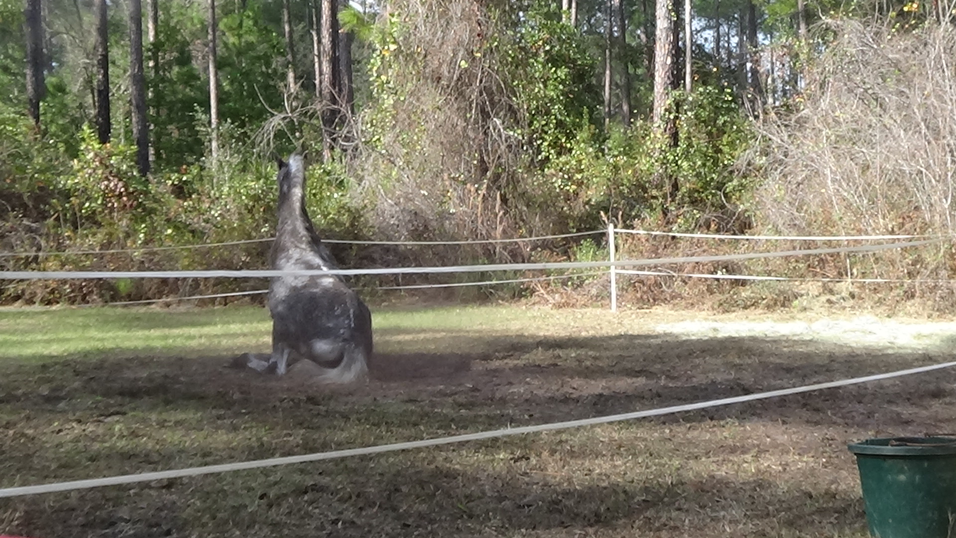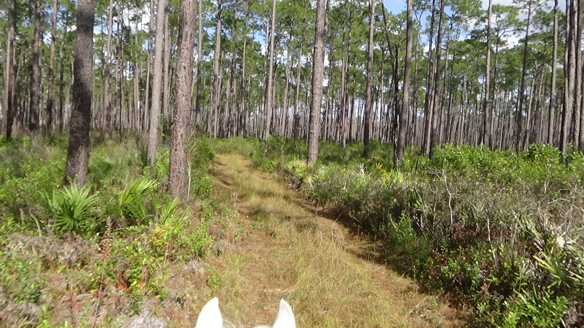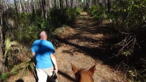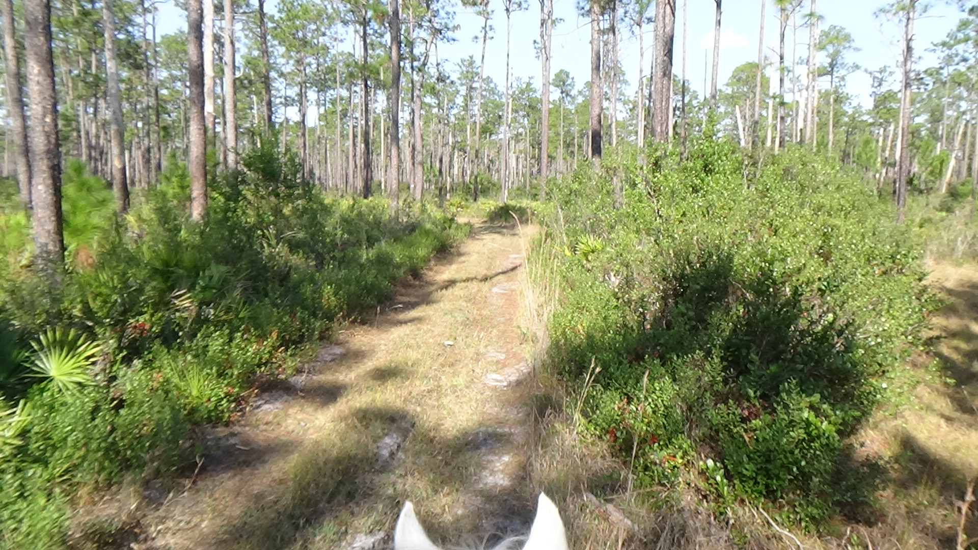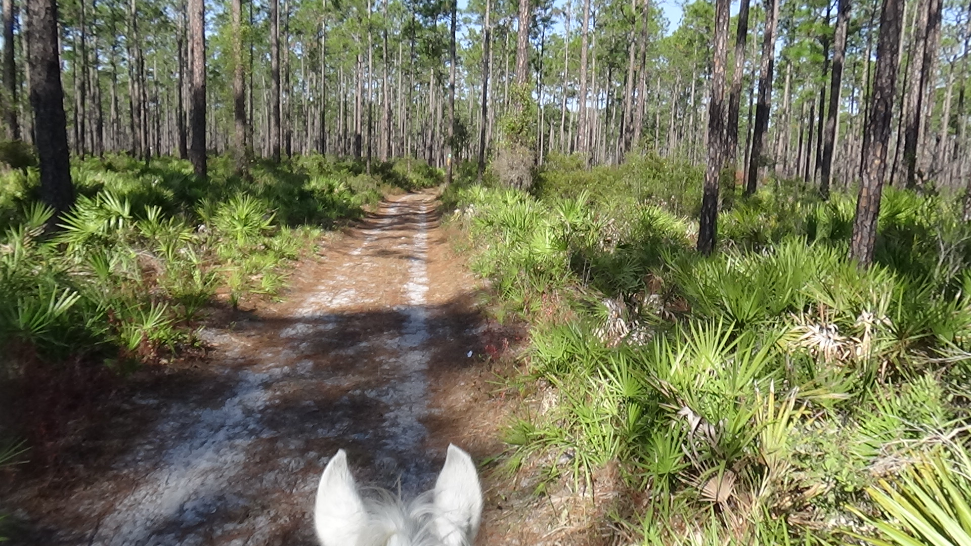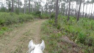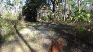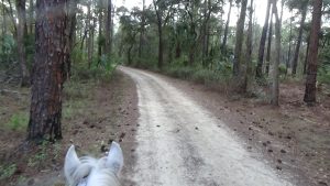 Had a great night sleep, finally found the right setting for the thermostat so that I would stay fairly warm in bed, while I try to stop being so stingy with propane that I'm uncomfortable! Woke up to the sound of thundering hooves, and sure enough, Flash was doing some self-exercising around the paddock. Guess he's ready for a ride! Did a little planning in the morning, then saddled up Flash and headed out, just as Art was arriving for his morning walk. I had texted him to suggest that if he wanted company, he was free to take Lola with him, and he just received the message as he arrived here, so he did take her. Flash and I headed out, trying to follow a trail that the trailmaster for the next ride had given me, though the map she uses is much different than the map I use, so I'm not certain I followed it exactly, but I did most of it. My Garmin died about halfway around, and even though I had four spare batteries, none of them worked! Guess they got a little rusty or old from sitting around in my horn bag for too long! Still, it was a lovely ride, and Flash did a good job, as usual. About a mile out of camp we ran up on a woman, Deb, who was ponying a youngster, and once Flash was bent on catching up, then as soon as we passed (after chatting for a minute), Flash decided that he needed a gallop, so I let him run until we reached Saddle Pen Road, which was lime rock, where he slowed down. Got back to camp and Art was still here, so I had him look at Flash's movement to make sure he wasn't limping, but he seemed to think he was okay. He didn't seem to favor any leg after I rinsed him off and put him away (after he rolled in the sand and dirt, of course!), so I guess he's fine. We chatted for a bit before he headed out, and shortly afterward, Lola came out and reclaimed her outdoor lounge chair! Read for awhile, then settled down for my usual evening. Another beautiful day in paradise! Love you, babe! Good night!