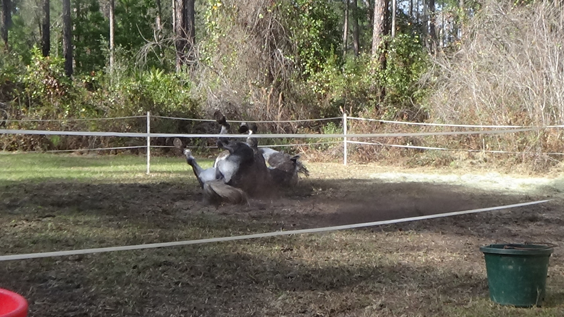 My plan today was to do a bunch of errands in the morning and get back to do housework this afternoon, but that didn't exactly work out as planned. My first stop was at Jo's to pick up a package with some med's for Lola and the pink flags I need for setting up the ride next weekend, and we took a few minutes for Lola to have a playdate with her four dogs, since she gets so excited every time we pull up into Jo's neighborhood. A brief stop at the Dollar store where I picked up a couple of things. Next stop was at the Triple J ranch where I had previously bought some really nice green coastal. I decided that rather than use the hay I had already stored, I would just buy enough to last me my stay here and leave those eight bales for the next leg of my journey. Unfortunately, they didn't have anymore of that nice hay, it was just your usual coastal, but Chelle had told me that Farmers Direct still had the greener stuff, so I drove up there. Turns out they were out of coastal, but had a truck coming in around 2:30 this afternoon. They were pretty sure it was of the greener stuff, so I decided to wait for it. While I did, I took a drive down to the trailer place to check on my little trailer, and learned the axles hadn't come in yet, so it would be mid-January before it would be ready. They had put the new roof on, though, so that was a major improvement. After that, I stopped at a park near the hay place, because I read they might have a dog park, but it was just open fields, so I just sat and read for awhile before heading back to the hay place. Eventually the trailer with the coastal arrived, and I was happy to see it was the lovely green stuff, so I bought another fourteen bales. Then I stopped at Helen's to pick up some cans for recycling, then I dropped those off at Forest HQ before finally getting back to camp around 3:45, much later than I had anticipated. Poor horses, I only had a few flakes to give them this morning, figuring I'd be back by noon, but they were waiting patiently for me, and attacked the new hay as soon as I put it in the paddock. Stored the rest of the hay under the gooseneck and finally was able to start my evening. A busy runaround day, but at least now I'm set for hay until I leave to head south. Gorgeous weather today, and more on the way, so I definitely would like to get some more riding in this week! Housework is calling me, so I'll have to squeeze that in sometime, but you know how that always ends up at the bottom of my to-do list. Time for bed! Good night, my sweet! Love you!