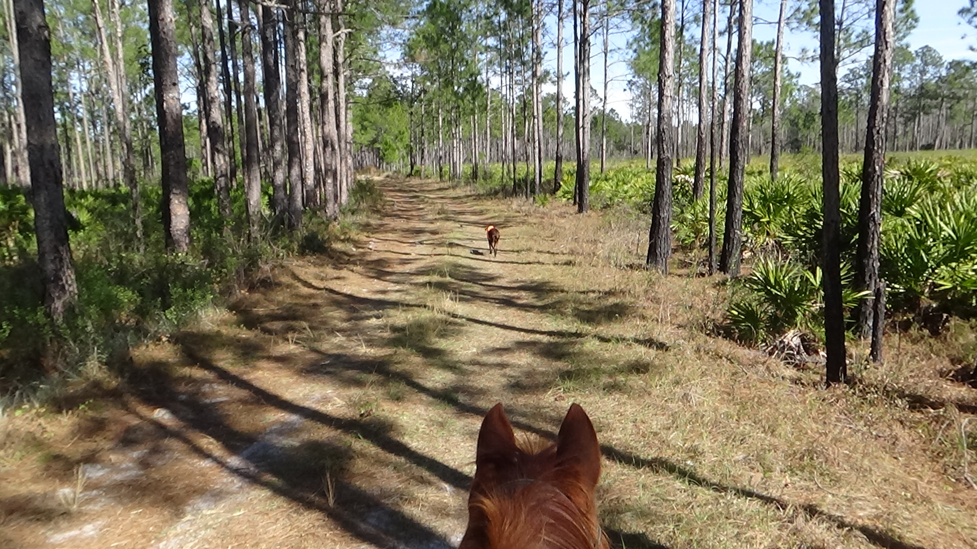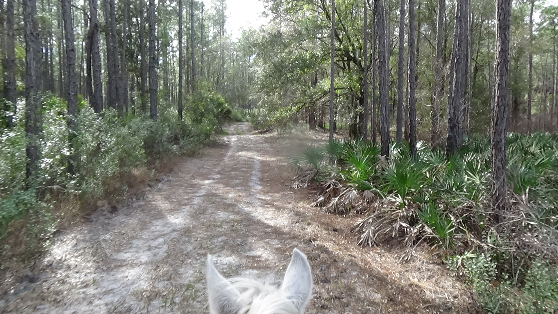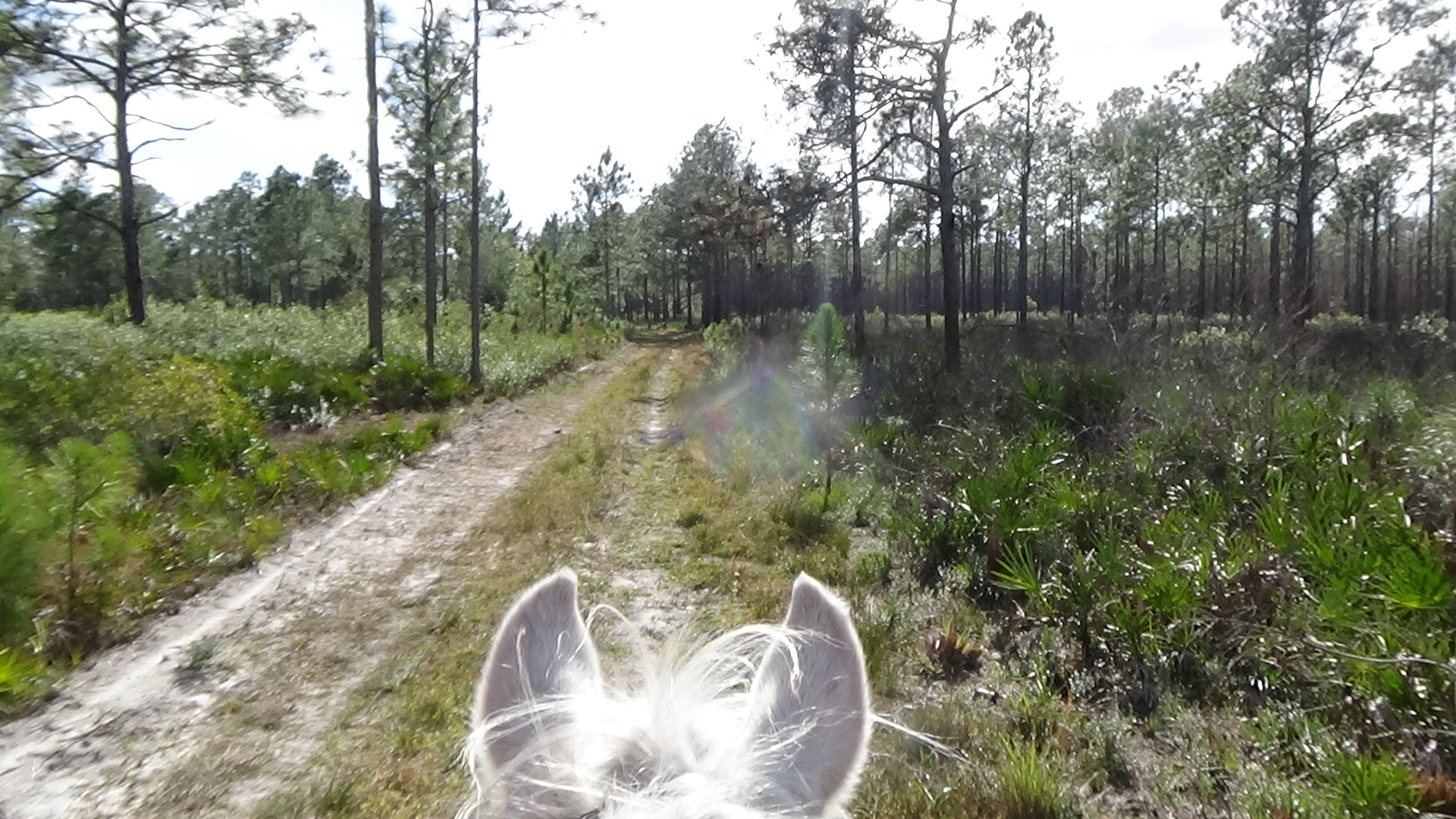 Had a good night sleep, woke up refreshed and ready to go! Got Flash saddled up and headed out for our first ride here at the Hampton Tract. It started on the road, which was typical Florida limerock, but it had a good swale beside it, so it was no problem. After less than a mile it turned onto a much nicer grass trail, as we followed the perimeter trails in a counterclockwise direction. We soon came across some sections that had been seriously dug up by pigs, so I'm guessing they have a big pig problem here! That slowed us down some. Once we got past though, it was fabulous for quite a few miles, and Flash was raring to go! We eventually went past a couple of lakes on either side of the road, and went through some really enjoyable sections, and then we reached another road, where Flash really wanted to move. Not surprising since it was headed in the general direction of camp! When we turned off that, though, we ran into a couple of long stretches of trail that had obviously been recently tilled, presumable as a firebreak, with no remedial action taken to smooth it out, so it was truly horrible for awhile. Eventually we got past that, and headed back to camp at a lovely pace. Since I've booked my Serengeti trip, and since apparently they do a lot of cantering (the antithesis of my Yellowstone trip!), I decided I better get as much practice in as I could, so we did a LOT of cantering today. Flash was certainly up for it! We did 15 miles in about 2.5 hours, so we were keeping a pretty good pace! Very happy with the ride today. Gave him a nice shower when we got back, and he even resisted the urge to roll, so all is right with the world! Except I had a problem with my little video camera, I could get the lens cover to close. The last time this happened on my old camera, it was because a few hairs had gotten inside the cap, so in the evening, I set about trying to clean it out. OMG, I had no idea! I started tapping it lightly and blowing on it, and the amount of hair and other particles that came out was incredible! I tapped for nearly an hour, and got hundreds of bits of hairs and stuff out of it! I have no idea how it got that bad in such a short time. I've only had that camera since August! Anyway, I did as much as I could, then found a nice little cloth envelope to put it in, hopefully that will keep the dirt out better. What a chore! Anyway, finally got that done, then I had to reheat my tea because it had gone cold while that job dragged on, but I won't be long out of bed now! Good night, baby! Love you!