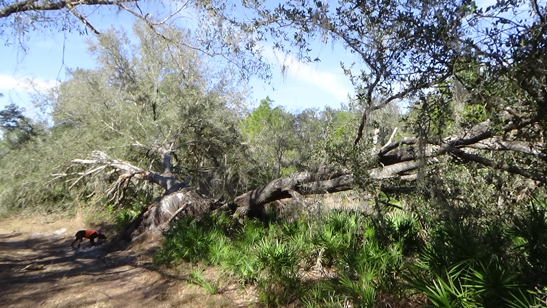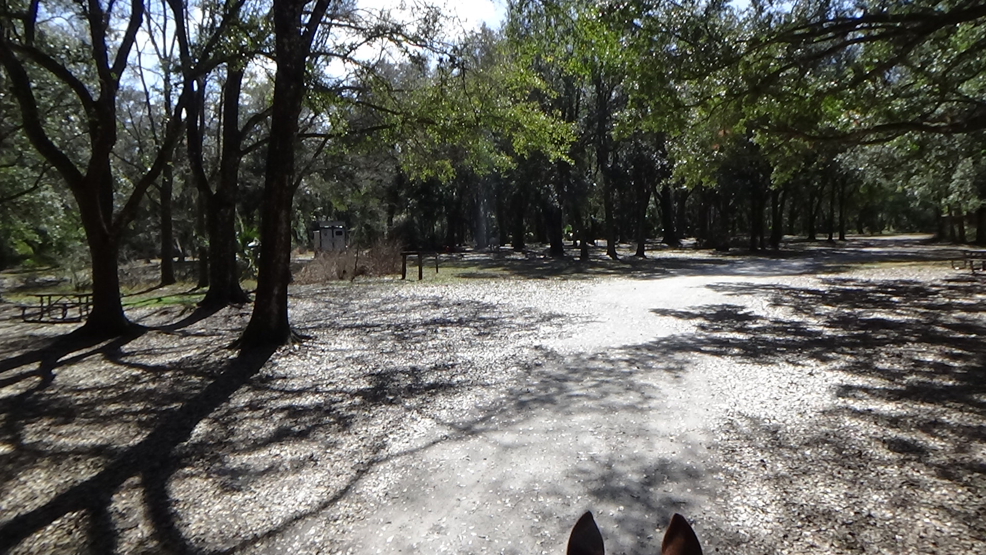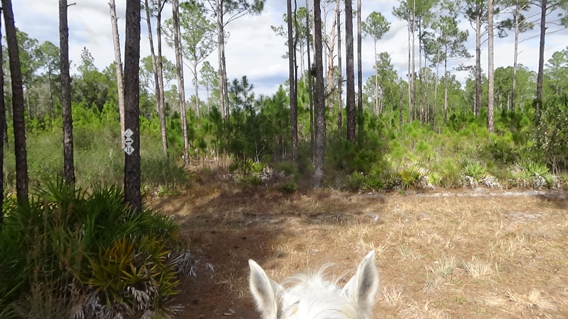 Had a good night sleep, woke up refreshed and ready to go! Got Flash saddled up and headed out for our first ride here at the Hampton Tract. It started on the road, which was typical Florida limerock, but it had a good swale beside it, so it was no problem. After less than a mile it turned onto a much nicer grass trail, as we followed the perimeter trails in a counterclockwise direction. We soon came across some sections that had been seriously dug up by pigs, so I'm guessing they have a big pig problem here! That slowed us down some. Once we got past though, it was fabulous for quite a few miles, and Flash was raring to go! We eventually went past a couple of lakes on either side of the road, and went through some really enjoyable sections, and then we reached another road, where Flash really wanted to move. Not surprising since it was headed in the general direction of camp! When we turned off that, though, we ran into a couple of long stretches of trail that had obviously been recently tilled, presumable as a firebreak, with no remedial action taken to smooth it out, so it was truly horrible for awhile. Eventually we got past that, and headed back to camp at a lovely pace. Since I've booked my Serengeti trip, and since apparently they do a lot of cantering (the antithesis of my Yellowstone trip!), I decided I better get as much practice in as I could, so we did a LOT of cantering today. Flash was certainly up for it! We did 15 miles in about 2.5 hours, so we were keeping a pretty good pace! Very happy with the ride today. Gave him a nice shower when we got back, and he even resisted the urge to roll, so all is right with the world! Except I had a problem with my little video camera, I could get the lens cover to close. The last time this happened on my old camera, it was because a few hairs had gotten inside the cap, so in the evening, I set about trying to clean it out. OMG, I had no idea! I started tapping it lightly and blowing on it, and the amount of hair and other particles that came out was incredible! I tapped for nearly an hour, and got hundreds of bits of hairs and stuff out of it! I have no idea how it got that bad in such a short time. I've only had that camera since August! Anyway, I did as much as I could, then found a nice little cloth envelope to put it in, hopefully that will keep the dirt out better. What a chore! Anyway, finally got that done, then I had to reheat my tea because it had gone cold while that job dragged on, but I won't be long out of bed now! Good night, baby! Love you!