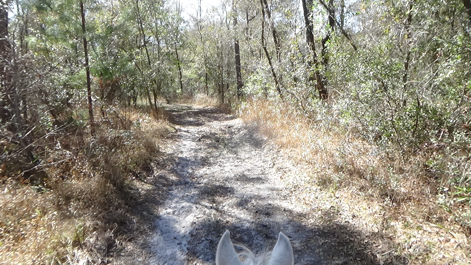 Had a great night sleep, once again getting my chores and breakfast done in a leisurely manner before saddling up Flash and heading out, this time to do the 20 mile Green trail that was used yesterday as the first loop of the 35. Got off to a bit of a rocky start when I thought the trail started up the driveway, but it turned out they were coming in that way, not going out that way, so when I finally figured out I was leaving from the same gate as yesterday, I had already clocked a mile going back and forth up the driveway! No worries, we finally got started on the right trail and this time, we headed more northeast, into sections of the Greenway I've never done. What beautiful trails! Some of the live oaks were absolutely huge, and stunning! Absolutely breathtaking. I only had one bit of confusion that was quickly cleared up by trailmeister Madelyn, but the rest was fine. This is truly my favorite endurance ride volunteer activity, taking down trail markers. I get to ride the trails without any stress of designing them or putting up markers. Even though I enjoy doing that, it can be taxing, but taking them down is utterly brainless and delightful! I even saw a pair of coyotes out and about, which surprised me in the middle of the day, but apparently they are so abundant here now, daytime sightings are becoming quite common. Flash wasn't quite as rambunctious today, but we still maintained a steady pace and got back into camp before 3:00, despite not getting off the property until 10:00. Lola got to spend the day with Art again, same as yesterday, so she's a happy camper, being able to get walks in throughout the day. After putting Flash away, I went over to our Cracker hostesses and chatted with them awhile, letting them know that there was a possibility I may need help getting out tomorrow. They went about making sure they had a key to the big tractor that sitting in the pavilion, just in case. It was a lovely chat. By then, dinner had arrived, so I went back to pavilion, and stayed through dinner and the ride meeting. Settled down for the evening, and once again, am up to teatime! Heading to bed shortly, of course. Tomorrow we will be doing the 15 mile white trail, so hopefully Flash will be good with that. Must be reminding him of the Shore to Shore Ride, when we were doing 20-25 miles a day, so tomorrow should be a breeze! Anyway, good night, sweetheart! Love you!