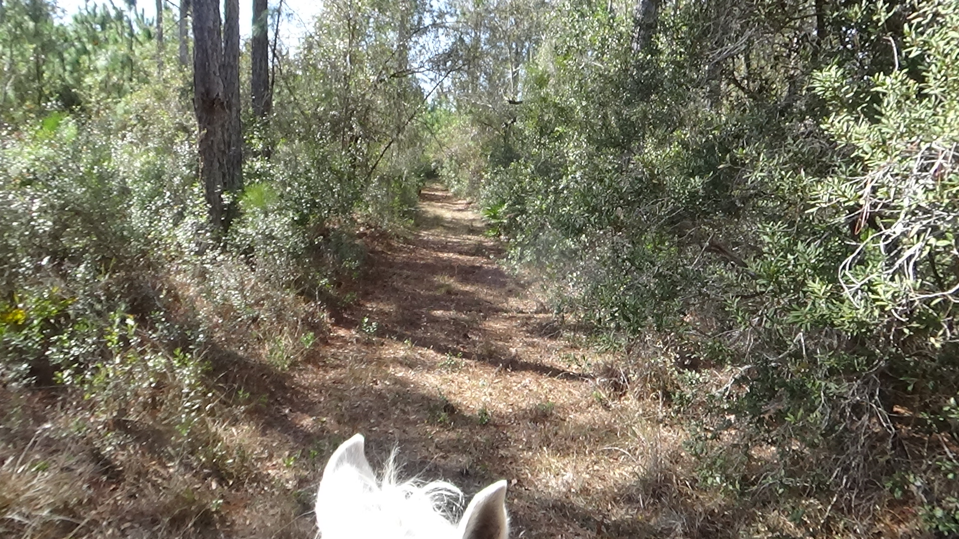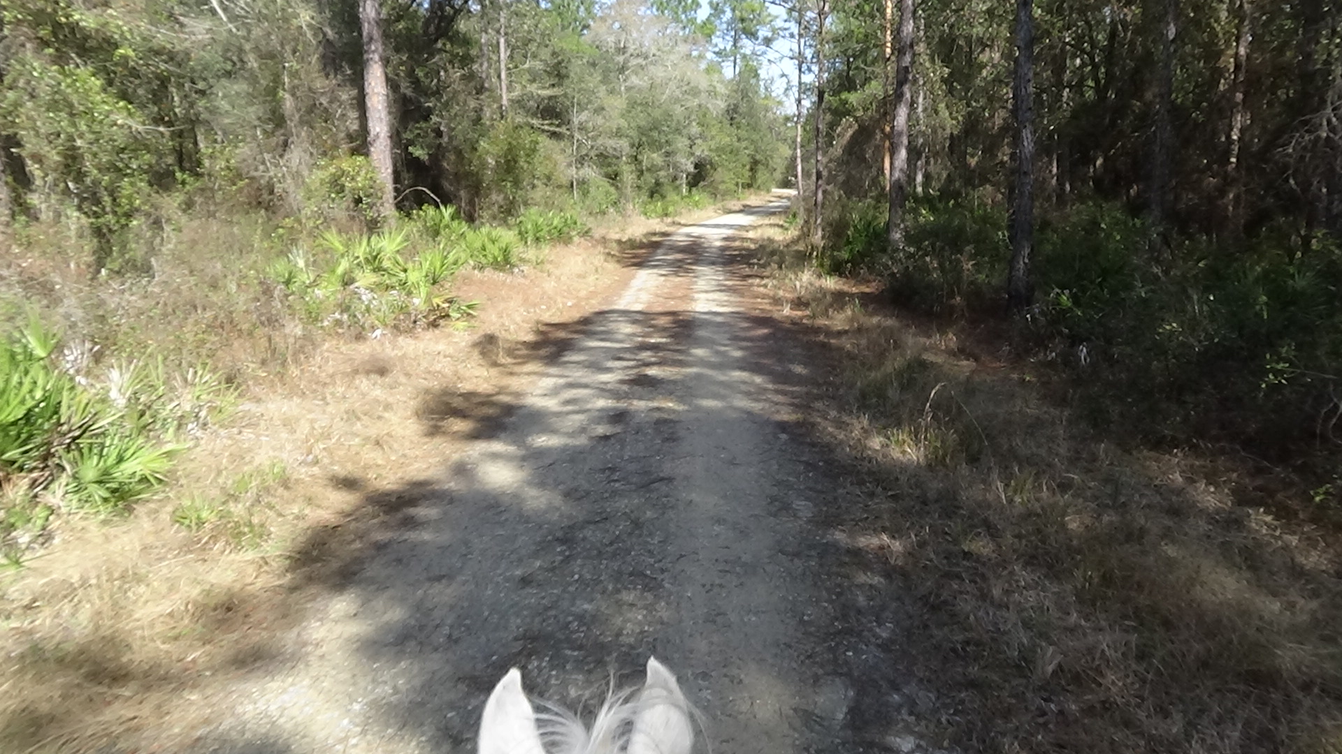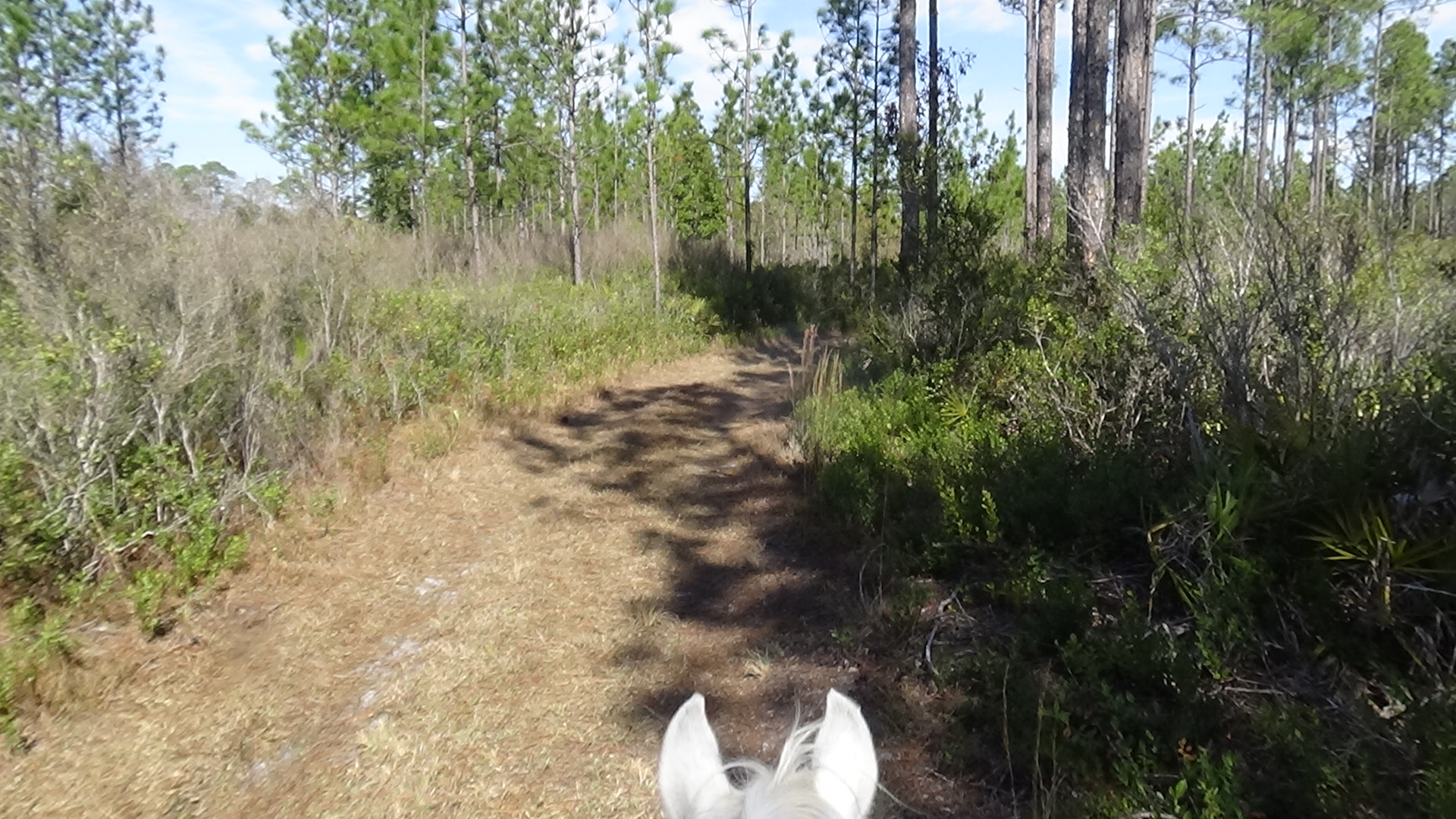 Had a lovely day today! The weather finally warmed up enough for it to be comfortable riding, so after spending some time in the morning trying to figure out how to transfer money for my vacation (STILL not worked out yet!), I saddled up Apollo, put on Lola's orange vest, and away we went! By noon, the campground was empty, so I wasn't worried about Lola on the trail. We went exactly two miles, at an average of 2.1 mph. Lola got way ahead as usual, but did keep coming back to keep us company. We did some lovely trails, though the last bit was along the road. Once we got back, I did a little more work on the computer, then started saddling up Flash for a ride as well. Another camper came in by the time we left, so I left Lola tied up at the trailer. She'd never be able to keep up anyway. Even though we only did about 7.25 miles, we only took an hour and a few minutes, so you can tell, he was really booking! We got lots of cantering practice in today! The only practicing I got on Apollo was my patience! But Flash and I made up for it, speed demon that he is! All cantering and gaiting after the first mile. Gorgeous! Gave him a nice bath afterward, since he had worked up quite a sweat. The trails were all nice today, none were tilled up, and only a few area showed pig sign, so it was a gorgeous ride. Put most everything away before days end, settled down for the night. Quite a few more campers came in during my second ride, evidently ready for the hunt starting tomorrow, but no rangers came around to kick me out, so i guess all is good. Going to try to get to bed early, though I'm under orders to not arrive at the Florida 100 before noon, and it's more than 90 minutes away, so I guess I won't worry about rushing out of here in the morning! Good night, sweetie! Love you!