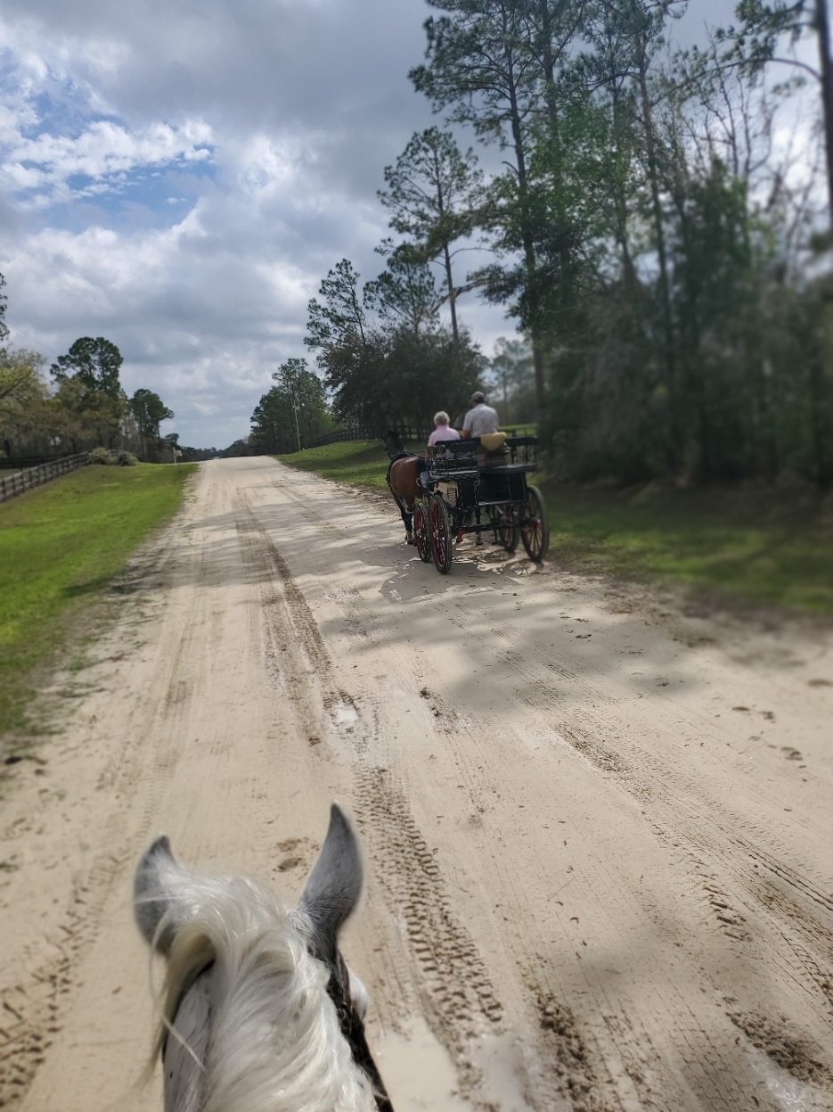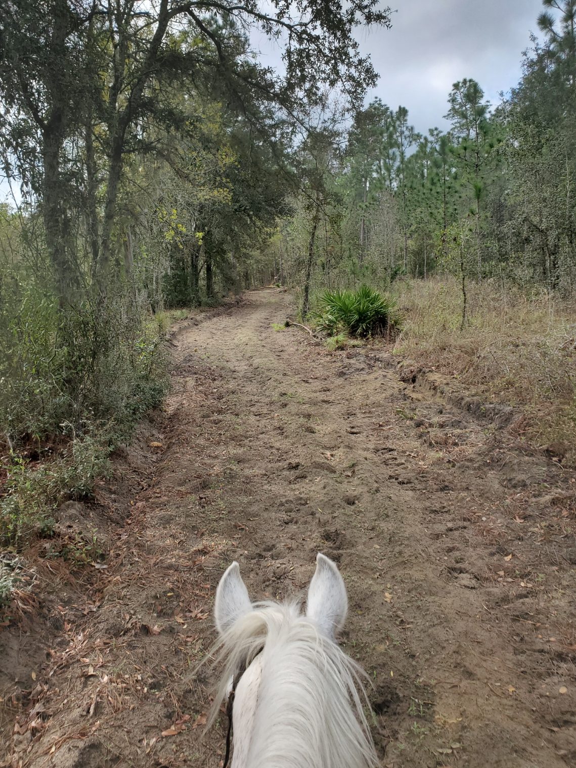 At the party last night, I met a woman from Maine who winters down here, a former endurance rider, and we decided to try to ride together today. I needed a little catalyst to get me going, since I'm still really tired from all the activity last week, but I just can't let Flash sit much longer, so we agreed to meet over at the Black Prong trailhead at 10:00. I was a few minutes late, darn it, but we weren't long leaving, so we headed out pretty quick. I decided to do some of the northern trails backwards from how I usually do them, so we started by crossing the street and going along 337 for a bit. We chatted and got to know each other, and was grateful her horse, though not gaited, moved out really well, so she and Flash were matched. Amazingly, Flash didn't feel compelled to be in front of her, which was astonishing! They went side by side walking for the first couple of miles, calm as could be. After we crossed back over the road, we started to pick up speed, and I gotta tell you, it was an absolute delight to ride with someone as enthusiastic about speed as I am! We gaited/trotted for a long way, again, side by side as if they were a matched team, despite their extreme breed differences and the fact the trails were just wide enough for two. Of course, we had to slow down for some areas that were torn up, but then we got a lovely section, and I mentioned it was a nice place to canter, so we took off and again, cantered/galloped side by side the whole way! What a fantastic ride! We saw a baby alligator about 3' long out on the green trail, and I saw a gopher turtle on the trail next to Helen's house. Nice to see some wildlife. We finally got back to the trailhead, got them some water, chatted a bit more, and then I went on my way home, completing a nearly 13 mile ride. I couldn't believe how well Flash did! He always pushed to be out front, but not today! Wonderful! Well, enough superlatives... Got back, rinsed him off and put him away, then started pulling out all my sewer hoses, plus the one Chelle lent me yesterday, to see if I had enough to reach her sewer trap. Alas, I was short about 10 feet, so I got online and ordered another 15' section, to arrive tomorrow. Gotta love Amazon! By then my energy was petering out, so I relaxed for a bit, watched a little TV, then settled down for the evening, my usual hot tub, shower, and soon to be bed! Good night, my darlin'! Love you!