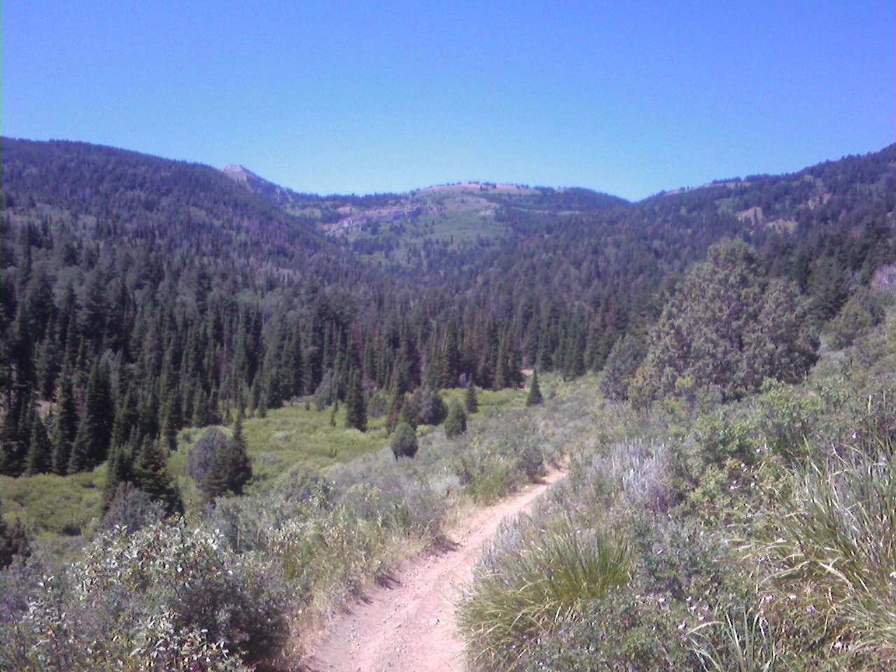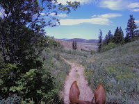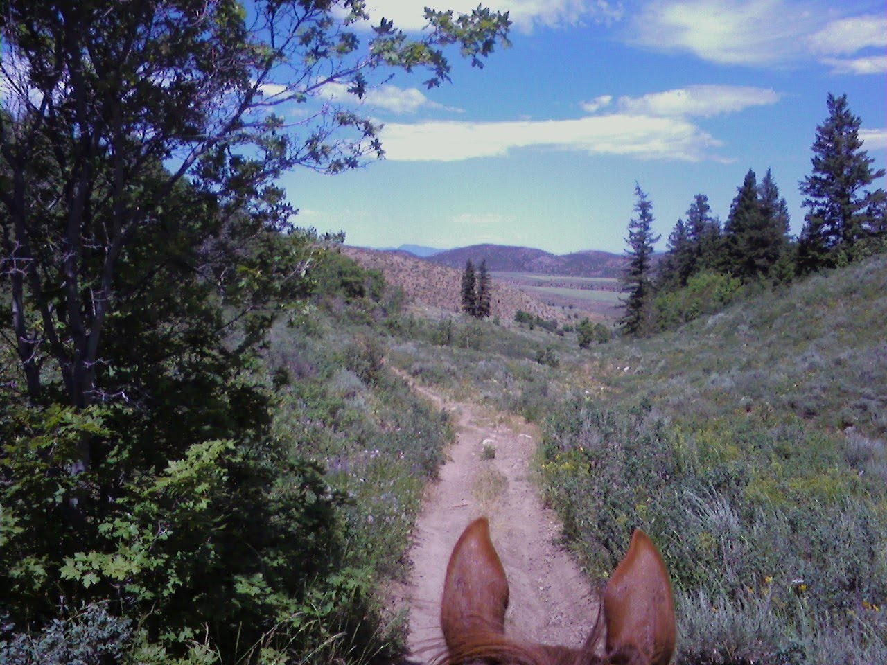 Tried again to find a trail map of the area, no luck. Just as we were getting saddled up, though, a couple with a horse trailer drove in, and Hubby asked them about the trails here. They told him about a loop that was about 5-6 miles long, so we headed out on the South Canyon Trail. We had to ride a mile on a gravel road to get to the trailhead (we had put the boots on), crossed the bridge, then turned left at the sign. Within a hundred yards or so, the trail started getting very rocky, and, unfortunately, stayed that way. This is a multi-use trail, and twice we had to get off the trail to let ATVers pass. We climbed and climbed on this rocky trail, and it wasn’t much fun. We finally reached the top, and stopped for lunch before descending on the other side. Fortunately, this side of the mountain was much less rocky, so it was a bit more enjoyable. We finally passed out of the forest (a mix of conifers up top and aspen down below, typical throughout this part of the West) onto a plain-like area that let us back to civilization and the gravel road. The couple that came in after us showed up some time later, and I asked them if there were other, less rocky trails, preferably non-motorized, but it seems pretty much all the trails here cater to the OHV folks. They did say that if we turn right at the bridge instead of left that the main trail in that direction is less rocky, so maybe we’ll try that on Sunday. Hubby and I spent some time this afternoon discussing the schedule and the travel plans, and just about the time we had settled on the next few weeks, I received an email from a client who wants us in DC at the end of the month, so now our plans will have to change again, though only slightly. Seems we’ll be flying out of Spokane now, I’ll have to find a place for the critters and the vehicles while we go. More research on tap for tomorrow!