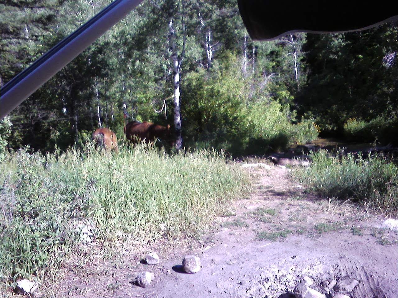 Made reservations for our flight from Spokane the week after next, checked out hotels, with the eternal debate of “do we stay out by the airport or do we stay closed to the Capitol.” Found half a dozen stables near the Spokane airport, I’ll need to call them next week if I don’t hear from my friends in Spokane as to whether they have a friend with a farm (the ideal solution, in my book:-). The ranger I spoke with about this campground last week stopped by to say hello today, asked if we would change the horses’ highline everyday to so they wouldn’t kill the grass. Funny, I thought they would have preferred to limit the damage to one area, but, whatever… We asked him about the least rocky trail, and he said that would probably be one that started in the opposite direction than the one our neighbor had recommended yesterday. Oh well, we’ll decide tomorrow. Spent most of the day working on the computer, planning the (new) next stage of our journey.