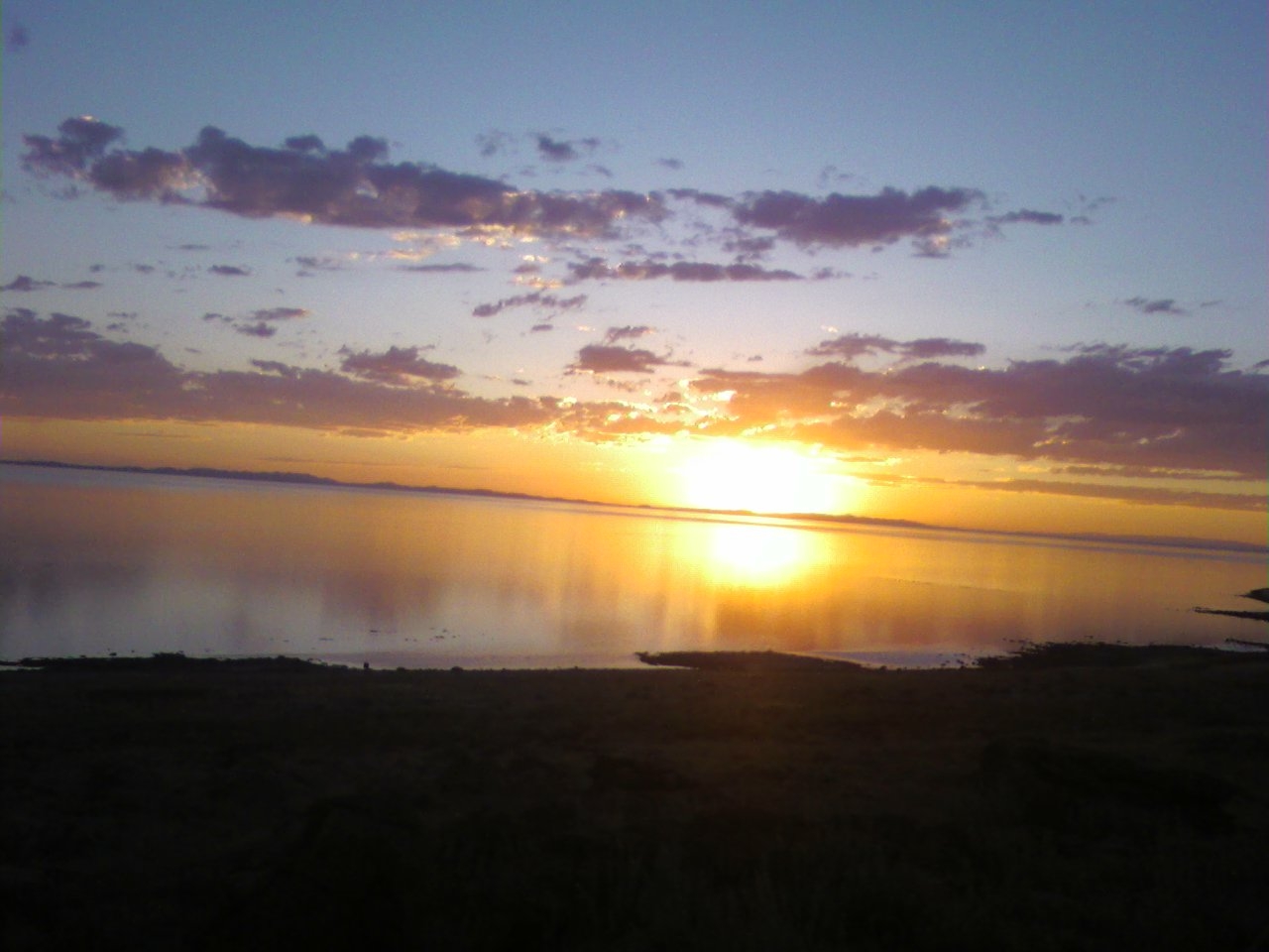 Had the alarm set for 6:30, had breakfast, saddled and booted up and on the trail by 8:30. Beautiful cool morning, but no breeze yet, we’re hoped we would get one before the heat of the day. Set out counterclockwise on the White Rock Loop, had a lovely canter across a long open field, stopping for a few minutes at the other side under a lone tree with a hitching post next to it. We took a side trip out to Elephant Head Trail, which took us out to a high point on the west side of the island, with grandiose views of the entire Salt Lake from north to south. Trails were sandy and rocky combined, so we were glad we had the boots on. After admiring the beautiful west side view, we headed back down, stopped again under the tree, had lunch, fed and watered the horses, then continued on the rest of the loop. Only saw a few antelopes, though we had our eyes peeled for buffalo, no luck yet. This trail crossed to the east side of the island, with another view of the smaller part of the lake, and the towns and cities on the other side. Got back about 1:00, a boring ride with spectacular views, boring because you could see the trail for miles ahead. Of course, the point was to experience every type of terrain with our horses, and we missed the grasslands on our way west, so this arid little island will do nicely. We relaxed in the afternoon, even took a little siesta, because we had decided to take a second, short ride this evening to watch the sun set over the Great Salt Lake. We saddled up around 8:00, arrived at the perfect spot for sunset viewing at about 8:50, awaiting the scheduled 9:00 sunset. It was beautiful. Blue sky with just enough clouds in the west to make it absolutely gorgeous. There’s just something about a sunset over water that just floats my boat. Growing up with a cottage near Lake Ontario, I used to walk several miles every night after dinner just to watch the sun set over the lake. It was the first time ever that we rode the horses two times in one day, and I think they were a bit confused, but seemed to take it in stride. They’ll likely have a few days off to recover anyway, as our trip tomorrow to Idaho is short, and we need to find more hay and a laundromat in the next few days. We should be able to ride again Friday if all goes well. A great day! Particularly as it washed away the memory of that last awful place!