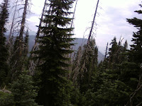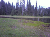Slept late, still feel like we’re catching up on zzzz’s, I guess we need a day that we REALLY take off, completely! Nevertheless, we were out of the campground, with boots, by 11:45. The only maps I could find on the internet in this area were cross-country skiing maps (there’s a ski lodge just across the street), which also happened to be good for horses, too, and the Pacific Crest Trail which apparently runs the entire length of the North American continent. We took a few of the short loops, then finally found the intersection for the Pacific Crest Trail (though it was only marked no bicycles at that point), where a pair of hikers assured us it was the right on, and they were kind enough to let us go first so we wouldn’t have to pass where it was more narrow. We climbed and climbed (again) in search of views of Mt. Ranier, which we never quite found, before heading back down to a lovely area full of lakes and grass for lunch, then back by 4:15. The trails were fine, mostly dirt with some areas of rocks, and the trees were magnificent tall firs, many of them hundreds of years old. The trail was well maintained, with quite a few foot bridges over muddy spots and no trees across, all had been cut up. Really pretty, and the weather was perfect, partly cloudy in the seventies. We even passed a surviving patch of snow, would you believe! The first week of August and it was still holding out! Settled down for the evening, catching up on the blog while I have a good signal Not so sure I’ll have one tomorrow!