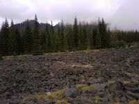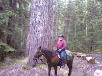 Slept rather late, nothing like a patch of peace and quiet to get a good night’s sleep! We headed out on the trail about 11:00. The trailhead has two separate trails leading out, one is Fossil Trail on the left, the other is Toutle Trail, which forks out later into Cinnamon Trail as well. We took Toutle Trail (328) toward Red Rocky Pass, which was a lava field with a great view of the mountain. We had heard Cinnamon Trail was very difficult, so we took a pass on that one. Toutle Trail took us past some huge pine trees, even larger than the ones we saw at White Pass. I guess the further west we go, the bigger the trees will get! The day was a bit misty, with a forecast calling for afternoon rain, but that is obviously quite typical here, as these massive trees also had moss hanging from their limbs, something we haven’t see since Louisiana. It was quite a nice ride to Red Rocky pass, albeit a constant climb, though the trail was a bit more rocky in places than we would have liked. The first part of the trail was covered with a fine gray ash, obviously a remnant of the volcano exploding some years back. We passed McBride Lake, circling on a rather narrow trail with steep drop that I wouldn’t recommend for an unseasoned horse. The climb ended at the trailhead near the lava field, which was a bit harrowing. Though some effort had been made to create a path on top of it by filling in the gaps with gravel, there were a few spots that were straight sharp-edged black rock. Thank goodness for Easy Boots! The unfortunate thing was that it was still so misty, we couldn’t see anything but the base of the mountain, and a quick glimpse of a bit of snow during one brief moment when the clouds moved a bit. We stopped for lunch shortly after at the junction of 238 and 231, where Hubby inadvertently left behind his gloves on a stump, then headed back toward the camp on 231, a decision we somewhat regretted, because there were long section of very rocky trail, including two lava flows we had to cross, that were nothing but big boulders and sharp rocks, and almost no trail to speak of. In fact, we never would have found our way across if it hadn’t been for ribbons someone had put up for a “Fun Ride” a few weeks earlier. I’m not sure I would consider taking my horse across a quarter mile of rocks “fun”, but trooper that he is, we made it with minimal discomfort. The trail was very rocky most of the next few miles, with signs that the last explosion of Mt. St. Helens everywhere, dead trees and large black rocks that had obviously just landed hither and yon. Eventually the rocks diminished a bit as we slowly descended. We reached a steep section, and part way down we started hearing firearms, as though someone were target shooting at the bottom of the hill. As we got closer, I yelled to hold your fire, horses coming, but the firing continued. Between earplugs and a radio blasting rock and roll, there was no chance of them hearing me until we were practically on top of them. I finally did manage to get their attention (there were three of them, two men and a woman), and they were kind enough to stop while we passed, though they started up again before we even left the parking area where they were set up. Fortunately, the horses were only mildly concerned, they’ve heard guns before, just not that close up. We crossed the road where the trail go a little less rocky, and were back in the camp in no time. In all, the ride was about 4 ½ hours long, a good length, though everyone was tired. Gave the horses an extra ration of oats, then made a quick dinner for Hubby (I’m dieting 🙂 before we went down to visit with the folks down the road. We spent a pleasant evening chatting, with a bit of theatrical entertainment provided by Hubby, which met with warm enthusiasm from the group. Having not made a habit of socializing, it was a nice change. Came back around ten, to bed soon after.