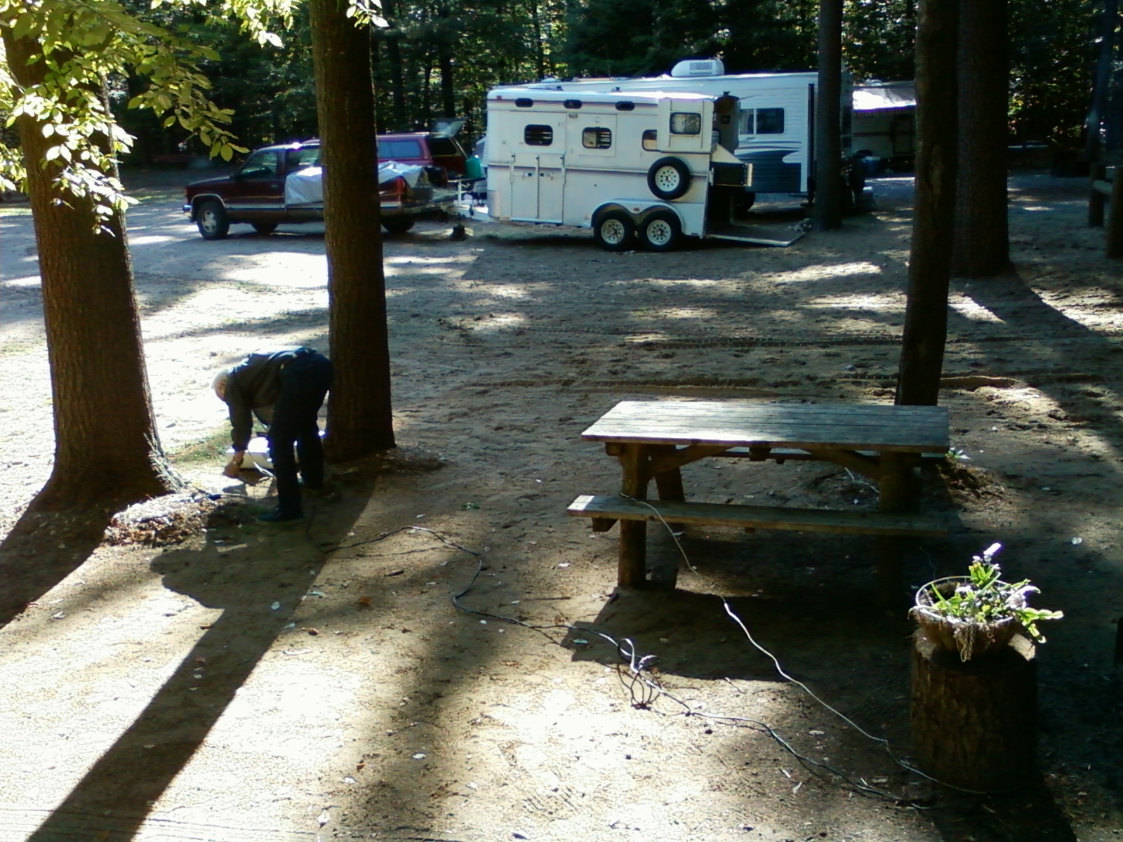 Spent the day really trying to get caught up, though the morning was wasted trying to help Hubby get a satellite signal, which he did even as it rained outside. He keeps getting a reading about the switch not working, but he finally gave up around noon, then headed out to do some running around, including getting our own adapter for the silly water spigot. While he was gone I got LOTS of work done (amazing how that happens : -)! which made me feel better after I was able to know out a couple of major projects done that had been bugging me. Finally managed to feel a bit more relaxed. Even though the campground is very crowded, it’s still quiet enough for me to start feeling more relaxed, though I’m still not sleeping as well as I usually do. Hoping to do better tonight, now that I have a few less things on my mind! Though it rained in the morning, it cleared up late in the day, and the weather forecast is for a couple of beautiful days ahead. There’s a hurricane (Irene) sliding up the east coast, but we’re so far inland, and on the far side of the mountains, that I don’t see it being much of an event here. Maybe a bit of rain on Sunday, but that’s about it. That’s good, because the horses will need a day off by then!