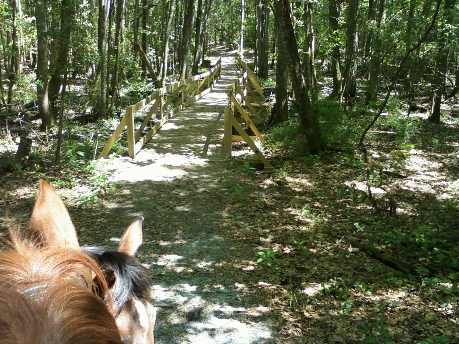 After spending the last few days resting and getting ready to leave, my brother and I enjoyed our last ride of the season together. The horse trailer is still full of hay (we’re slated to move it over to the back of the pickup tomorrow, when he has some help coming in to do some other chores around the house), so we opted to just ride around the neighborhood. This time, though, Brother wanted to go across the street to a wilderness area that he used to ride in back when he had horses. The weather was warm, but not as hot as it has been, and there was a nice, albeit warm, breeze that helped keep it from being stifling. After leading the horses across the busy road, we discovered the area he used to ride in was fenced in now, but there was an actual trail sign pointing down the length of the canal, so we headed south down there. It was like a regular nature tour, where we saw lots of turtles and all kinds of birds, with a keen eye open for alligators, as it’s supposed to be mating season. Brother wasn’t sure they would be coming in this far, though, because the water levels were pretty far down because of a lengthy drought they’ve been having here. Never saw one, anyway, though we heard a baby one on the way home (at least according to him :-). Stayed out quite a bit longer than I expected, I guess he wanted to make the most out of it since it will probably be the last time he rides until we come back next year. Followed the canal back, probably 4-5 miles, before finally turning around and heading back. We stopped a few times to stretch our legs, so we ended up being out over 5 hours. We mostly walked, but on the way back he did start speeding up, we managed to get a good number of trots and canters in. A lovely ride, and a great way to end our time here. Will spend tomorrow getting ready to go, giving Brother some last minute lessons on his new/my old computer, moving hay, and generally packing up. Ready to get back on the road again!