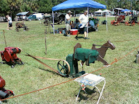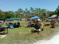 Every year the town of Jupiter holds a Farmstead Days event a Riverbend Park where we’ve been riding. Brother said it if you like old mechanical devices, it’s a great way to do so, free. So we arranged to meet him and a couple of his friend over there in the early afternoon, and spent more than an hour wandering among old tractors and engines, some of them steam engines, dating back to the 19th century. Many were designed for specific jobs, like pumping oil from a derrick, squeezing sugar cane for syrup, running an old wringer washer. Almost all were actually running, which made it very interesting, with the sounds a cacophony of sputters and sparks, revs and bursts that sounded like a motorman’s symphony. Really fascinating. They also had a small petting zoo for the kids, with lambs and kid goats, bunnies and even a little black piglet, along with pony riders as well. Music was being played throughout the day at the pavilion by local artists and story tellers, and kids were getting free rides on a couple of the antique tractors, some so old they had metal wheels. There was an old Model T Ford “Dixie” edition that apparently was only sold in the south (made six inches wider than normal to avoid wagon ruts), and a portable blacksmith shop with all the tools, including a forge, that a blacksmith would need to build all of the magnificent machines. The highlight of the day, though, was the sawmill demonstration. Permanently on the site is an old sawmill powered by an old belt-driven motor. One younger man and two seasoned seniors (who look like they had been working the sawmill since the CCC days -the 30’s- when the sawmill was set up here) worked some raw logs through the machine, brilliantly turning them into a number of long boards, even finishing them with a smooth edge. Fascinating to watch! Well worth spending the time there, it was a very nice day.