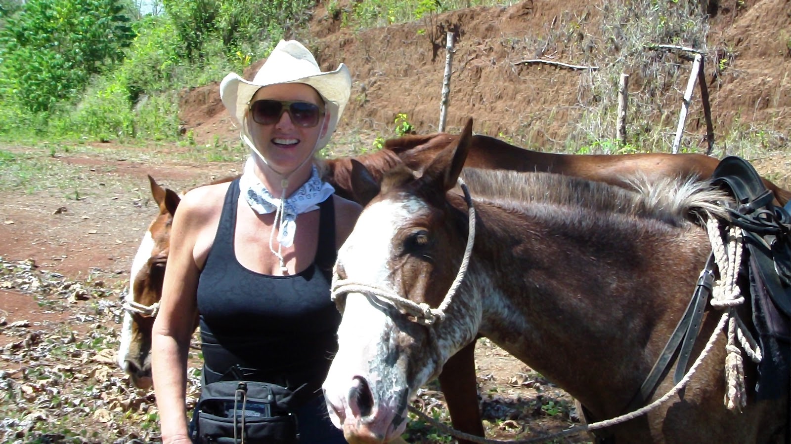 Once again woke up at the circadian crack of dawn, to breakfast at 7:30, in the saddle just after 9:00. Today we rode to the beach, mostly walking for the first 45 minutes or so. Stood under a tree on the beach for a while, apparently the footing was too soft for the horses to actually travel on the beach, at least according to the wrangler Albin (though it looked pretty good to me, but I had to defer). We finally headed back (w/Hubby making the joke, “I thought we were waiting for the sunset”: -), and once we got to a field, we were at last allowed to canter for a short bit. Shortly thereafter we came to another big field, where all the testosterone fueled a series of horse races across the field. Frankly, I really enjoy cantering nice and gentle more than I do an all-out gallop (or at least in addition to), so I held my horse back (who fortunately was willing to let me, albeit reluctantly), and I got a few nice canters back and forth across the field before we moved on. Albin’s horse nicked his face on a strings of barbed wire going through a fence, and even though it was small, it bled like crazy (as horse heads always do), so he decided to walk his horse back and let his assistant Michael finish the tour. I’m not sure what it was, but as soon as Albin was gone and Michael took over, the atmosphere immediately relaxed. Albin seemed pretty disinterested in the tour, simply going around the farm and letting us follow him (always at his pace and always on his cell phone), whereas Michael immediately starting pointing out more wildlife, picking a branch of blossoms off of a tree to show us, taking time to let us see things, and being very aware of satisfying our needs. When we reached the stretch where they usually gallop the horses, he veered off into a field so we could gently canter, then once we got back to the road, made sure we made the turn where I fell yesterday before giving the okay for everyone to gallop if they wanted. I again held back a bit to my preferred until we got a little closer to the barn, then let my horse loose to run the last few hundred yards. It was probably the best of the four rides, especially once Michael took over, so we left the barn happy. Got back to the rooms and started packing until lunch at 12:00, anticipating a 1:00 pickup that ended up not happening until 2:30 because of road works and bad Friday traffic. Had to stop at the CienFuego Eco-ranch for the German couple we had crossed paths with earlier, (where we got a chance to say hello to my previous horse Peluche, and I even had a few hard berries that Lucero had refused to eat this morning, but that Peluche LOVED!) It was even hotter there than on the coast. Piled everything and everyone in and headed to San Jose, where, after getting stuck in rush hour traffic, we managed to arrive back at the Hotel Bougainvillea by 6:15, said our good-byes to our great host Paulo, settled into our rooms before heading back downstairs where we enjoyed a drink and dinner with our fabulous new friend Bill before parting company at about 9:00. Bill will be leaving very early in the morning, so we won’t see him again here, but I think we all felt the time would come when we’d get together again, as we really had a great connection, lots of laughter and hilarity when we’re together. Off to the luxurious bed, without even turning on the TV once! (pix to com)