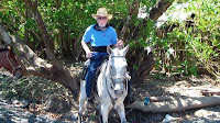 Not a great night sleep, I’m afraid. The wind kicked up around midnight, slamming doors all through the house and generally disturbing the peace. The smell of the thinner remained fairly overpowering, and the hard bed and pillows made it a rocky night. The banty rooster started crowing at about 4:45, then the howler monkeys started howling around 5:00 (though I only heard them once before going back to sleep. Bill said they kept going about an hour). Finally, the house was waking up by the time the sun came up at 6:00. Anna the cook had already been hard at work over the campstove just outside our open door, clattering pans and washing dishes and grilling food, etc. Breakfast was served at 7:30, and we chatted comfortably, getting to know each other better, having some good laughs and generally spending the rest of the morning relaxing and trying to reserve our energy. Bill went on a short walk to a waterfall with the rest of the gang, Hubby and I were just too darned tired, so we lay down and read, and fell asleep a bit, before everyone came back. Anna, who had gone on the hike as well, quickly went about the business of getting lunch ready, and before we knew it, we had another big meal in front of us. Afterwards, Stanley and Bolivar got the horses ready for our afternoon ride, after apparently giving them a B-12 shot this morning to help in their recovery from their exhausting day yesterday. (Could have used some of that myself!) Rode back down the road away from the ranch, getting a good view of what we didn’t see in the dark last night, some beautiful views (the lodge is pretty high above a valley), lots of cows (Bill was going crazy, he’s a bovine-loving boy!), though we stayed mostly on the roads, eventually arriving back in the village at the cantina (must be somebody’s cousin), where we had drinks (whiskey and ginger ale for us, cervezas for most everyone else) before heading back up the hill to the lodge. Arrived back at about 6:00, just as the sun was setting, took some more cold showers and had another nice meal courtesy of Anna. By now the tension of the previous day had waned, and we were all looking forward to a good night sleep, though we did hang around at the dinner table having some good conversation for some time after dinner. Very much enjoying Bill, he’s quite the fun guy!