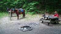 Lots of rain, thunder and lightning overnight. It’s funny, but up here on the top of Sugar Hill, the thunder seems to just go on forever, echoing from one end of the horizon to the other, and seemingling, back again. It reminded my of growing up in nearby Rochester (NY), it was the same way up there. I can’t explain it, the sound just seems to last longer, reverberate stronger, change tempo and volume during its course, and roll around in a way I’ve never experienced anywhere else. Weird! Anyway, spent the day catching up on my blog and doing laundry, putting up a clothesline on a couple of nearby trees. The camp was empty by last night, no one here this morning, either, as expected. There was a slight chance of rain, but by the time we finished breakfast, it was clearing up, so I decided to risk it. Quite a strong, cool breeze, so I figured the clothes wouldn’t take long to dry, and I was right. A quiet day all around, nice. Tomorrow we’re planning on going over to Watkins Glen State Park and actually be tourists for the day, figure the horses will be safe if we put them in the covered stalls instead of on the highline. I’m a little worried about Hubby’s mare, she doesn’t seem to like this new hay, kind of stalky, may be hard on the old girl. I put her out in the yard to much on grass for much of the day, until I looked up and saw her eating out of Apollo’s hay bag, much to his dismay (he wasn’t about to argue with Mama). I moved her back to her hay, and she munched awhile, then they napped. The first of many days off, we probably won’t be able to ride again until at least next Tuesday or Wednesday. We reservations at Bear Mountain Springs near Walton, NY for the week.