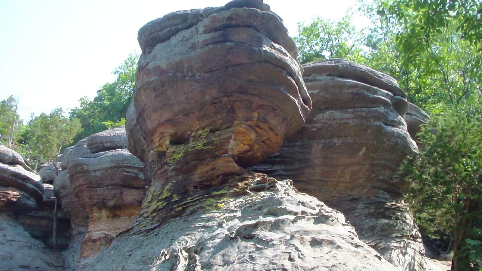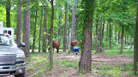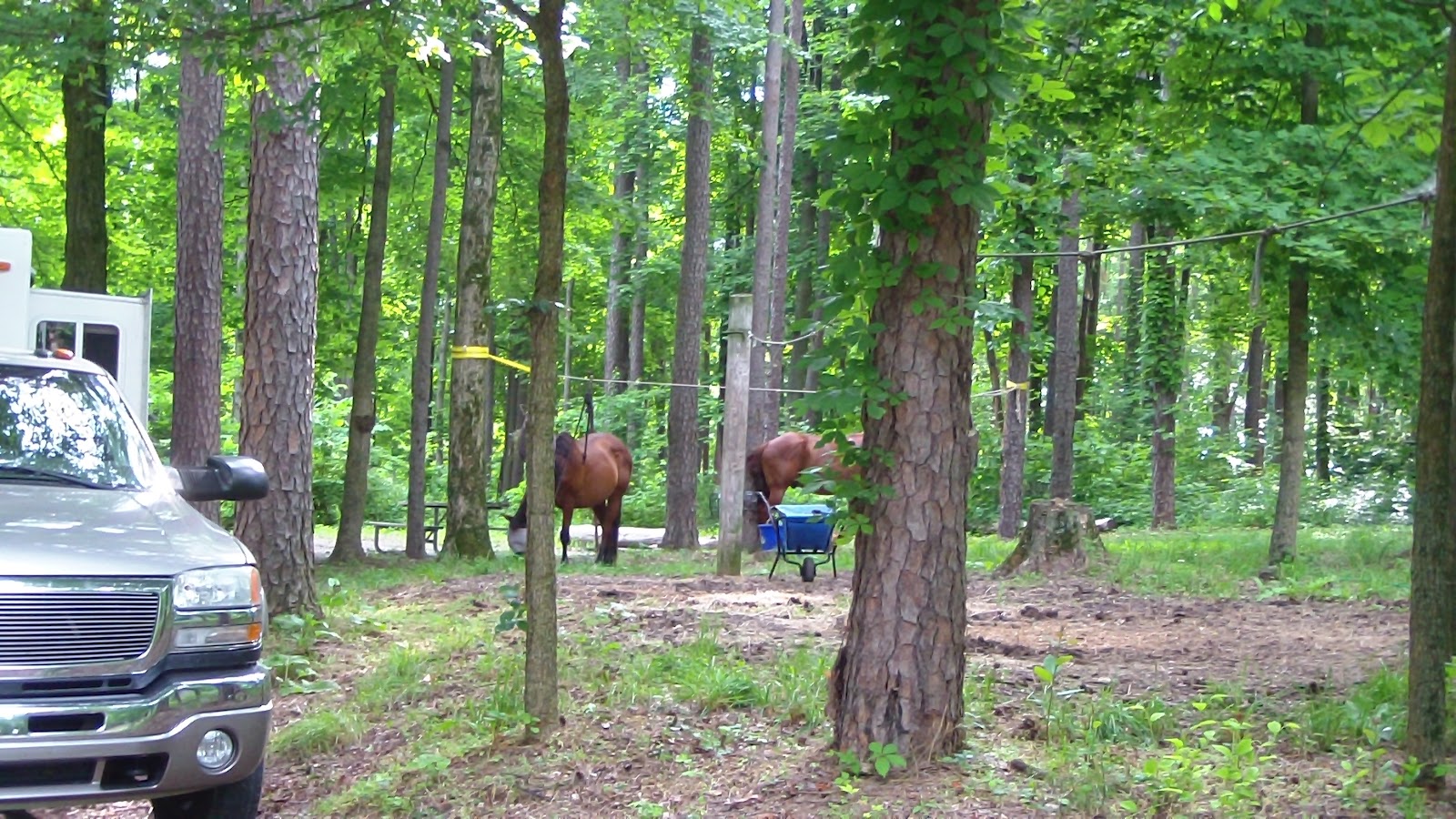 Another beautiful day, perfect weather with cool nights and temperate days, such a relief after the 99 degrees in Illinois! Headed out on the longer trail today, though the entire loop is about 19 miles, we have no intention of going that far, just out to a mid-point and back. We decided to make that mid-point a boat ramp, and again, we had some lovely trots and canters along the way. Saw a deer on the trail, and after it ran off to the left, I saw a tiny fawn that couldn’t have been more than a few days old run off the to right. Naturally, Mama didn’t go far, so I managed to get a picture of her, but baby became invisible, all those spots disappearing in the woods. Part of the trail was actually an old, overgrown paved road, but it was so narrow it was more like a trail. We don’t mind tarmac much, it’s gravel that drives us nuts! We only got lost once, when the poor markings prevented us from making the right turn onto the Cliffs Loop, which turned out to be our favorite trail, so we ended up taking it backwards from how we intended, and we had to re-do the front half of the loop, which was no problem. We liked that loop because it had a nice turn-off where someone had put up a swing-line for jumping into the lake, and it was a good 20-25 foot drop to the water, so it looked very inviting! Had I been younger or dumber, or been with folks who would’ve dared me to, I might have been tempted! But with just Hubby, well, I had to take precautions and do the safe thing… :- ). As we headed back to camp, we decided to complete the circuit by taking the final few loop trails west of the campground, and they turned out to be very nice as well, older woods than we’d seen in most places, nice and deep, with a few mild ravines, just the way we like them. Overall the trails here have been very nice, just a few areas of stone and gravel, more mud than we like but not insurmountable, and I’d rather have mud than gravel any day! Headed back, had another nice chat with the ladies across the way, and learned that one of them made hay, which I am in need of, so I was happy to make a deal to pick some up on our way out on Wednesday. They, too, are leaving on Wednesday, so it all works out just fine. Got everyone settled in and fed, and had a relaxing evening.