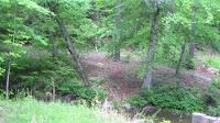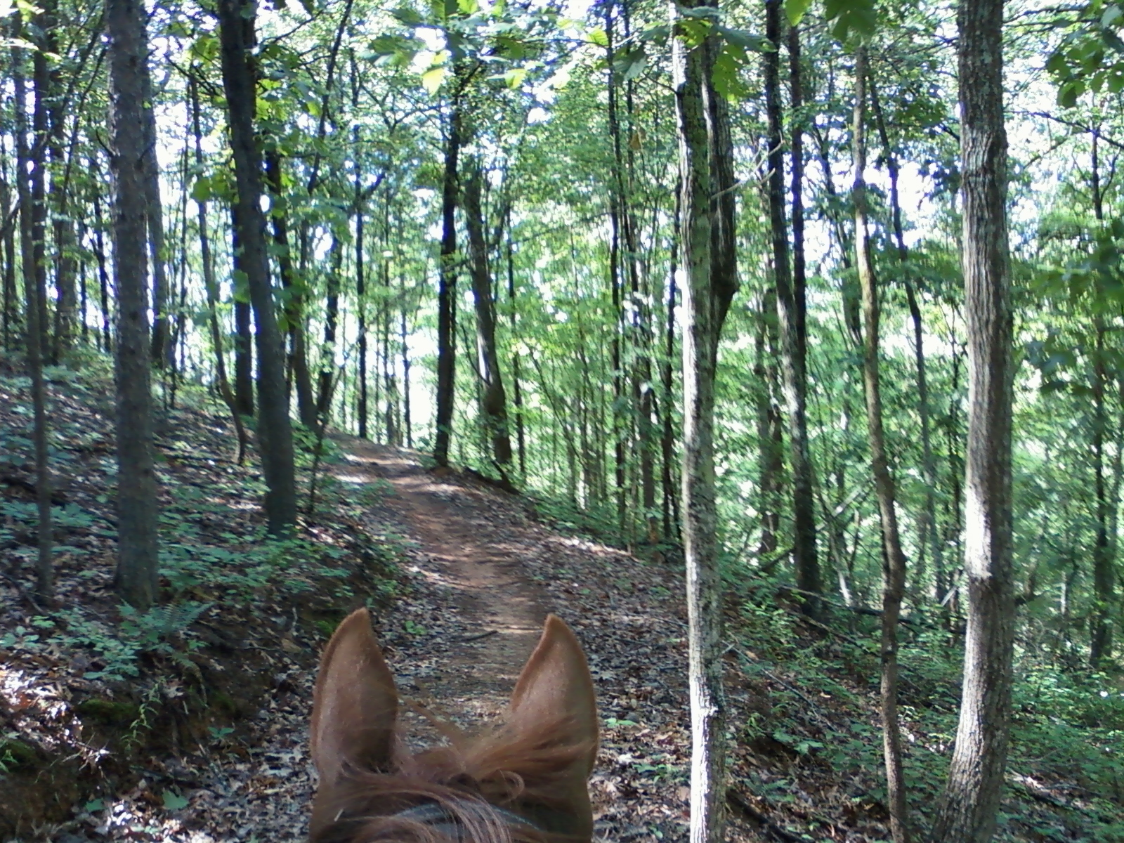 Woke up early even without the alarm this morning, though Hubby was a bit later than me. I had the horses fed and watered, their highline area mucked out, the dogs walked, and even took an extra walk down to the end of the horse camp just to see what it looked like before Hubby even got out of bed. There’s no one here but us, the place is empty, but there are a lot of signs this is a busy place. Sometimes we go to a horse camp and it doesn’t look like there’s been a horse in there for months, even years! But here, there was obviously a lot of activity over the weekend, at least a half dozen sites still had garbage in the trash cans scattered generously around the campground. After breakfast, we met the rec tech Ranger who was testing the water and doing other chores, then we saddled up and headed out on the White Trail, the shortest (just under 4 miles) just to give the horses a chance to stretch their legs. They were in the trailer a long time yesterday, so we didn’t want to wear them out too much today, and, weather permitting, we’re planning on taking them on a 16 mile trail tomorrow. Anyway, I had reconnoitered the area earlier when I had gone out to find a cell phone signal (the only drawback here), and we headed straight out the White Trail from the campground. The trails were VERY well marked, I never had to look at my trail map once, which always makes for a much more enjoyable experience (getting lost is always stressful), and the trail was marvelous! Lots of variety, deciduous mixed with an occasional pine forest area, good footing of mostly hard dirt, very few wet spots, even some great straightaways for fantastic canters! Couldn’t have asked for more! There were some stones on the trail occasionally, so we’ll likely put boots on the horses tomorrow just to be safe, but really, very few stony areas to bother a barefoot horse. What a great ride! And even though it was mid afternoon, the temps were quite nice in the forest, with plenty of shade to keep the heat from getting too bad. It only took us a little over an hour, but it was fantastic! When we got back, we spent a little time doing some hoof trimming (the warm weather really makes their fee grow fast), then we settled in for the rest of the day, though I took one more trip out to check my email, this time finding a signal much closer, thanks to the ranger’s suggestion about where to go. A lovely relaxing evening.