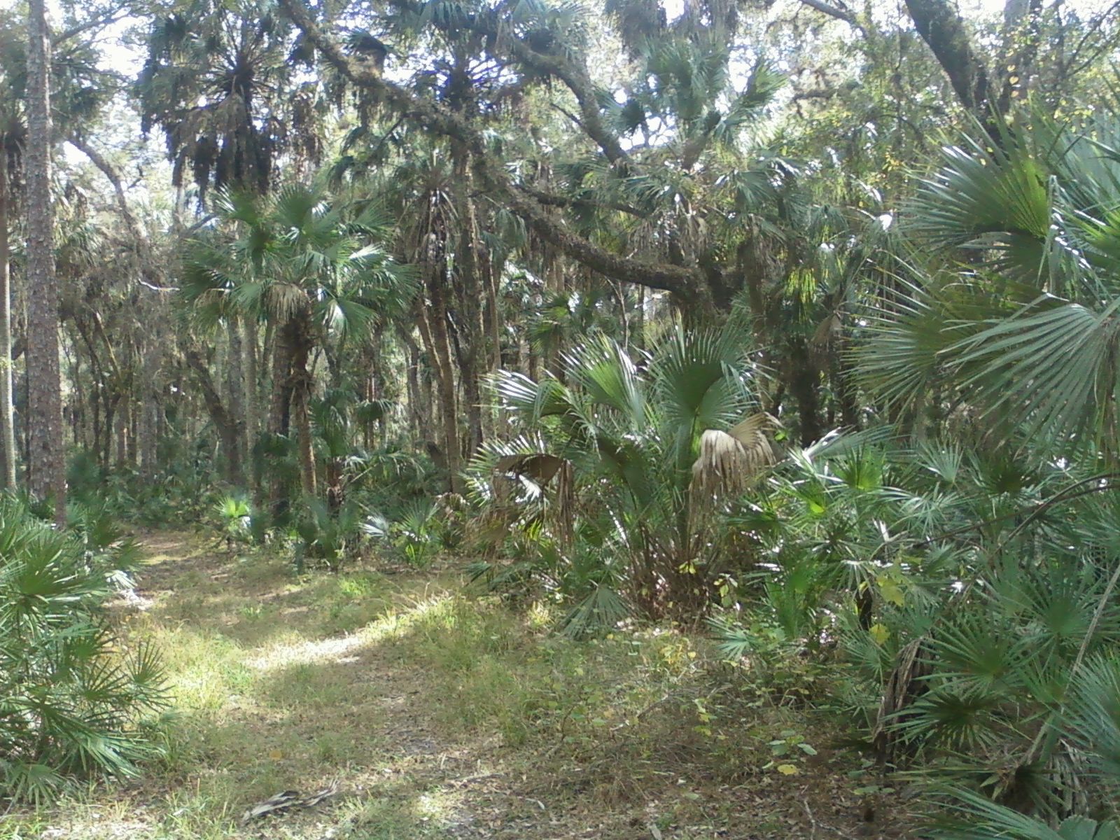 Headed out a bit earlier today after getting a bunch of work and phone calls done. Brother in ICU is doing better, still on a ventilator, but that’s supposed to be coming later off today. On the trail by 11:15, taking some secondary trails that aren’t marked on the map, beginning with leaving the horse camp to the north, then west, which was essentially a perimeter trail and a firebreak. It was a wide swath of grass that was pretty badly torn up by the wild pigs in a lot of places. We headed south on the first main trail, which soon ran us right into the main trail again. We took that west some more, then north again at an intersection that had a big X marking the spot, as if it had been a makeshift helipad of sorts. It’s also where the bike trail joins the horse trail. Took that back to the firebreak, headed west again until we came across another trail heading south, but this one was SO much better. It headed into what is truly the first tropical forest we’ve seen yet. Lots of palm trees among some scattered old live oak and magnolia, along with lots of scrub palms on the ground. It felt really magical there, like an enchanted forest, and it obviously hadn’t been traveled anywhere near as much as the rest of the trails we had seen, though there were some signs of a few horse passings. That meandered around a bit, which was a nice change from all the straight lines we’d been doing, until it finally met up with the main trail again. We turned around at that point, though, because we had seen another trail head off to the northeast, so we backtracked to there. Along the way, we not only came across lots of pig sign, we came across lots of pigs as well. Though the horses did a lot of snorting and whirling and sometimes just froze in place, they were a bit less reluctant to move forward when asked, as if they were starting to get used to the pigs. At one point, I swear, Apollo was actually strutting at the fact he managed to get the pigs to run away from him, as if to say, “I’m the Man!” At any rate, we made progress getting over the pig phobia they’ve had, which will be helpful as time goes on, since there’s obviously a major pig infestation going on in south Florida these days. We also saw a couple of white tail deer, and they, too, caused only a small start from the horses before they moved on. Good to see them getting used to wildlife around them! Got back early, as we want them to get used to being ridden every day, but not for hours and hours every day, at least until they’re better conditioned. Rinsed them off, which was pretty pointless as they both rolled in the sand within a few minutes of that exercise. Fortunately it rained later on in the evening, and that rinsed them off again. Had a quiet evening, then heard that my brother was off the ventilator and doing better shortly before heading off to bed.Tuesday, January 17, 2012 – First Ride at Highlands Hammock