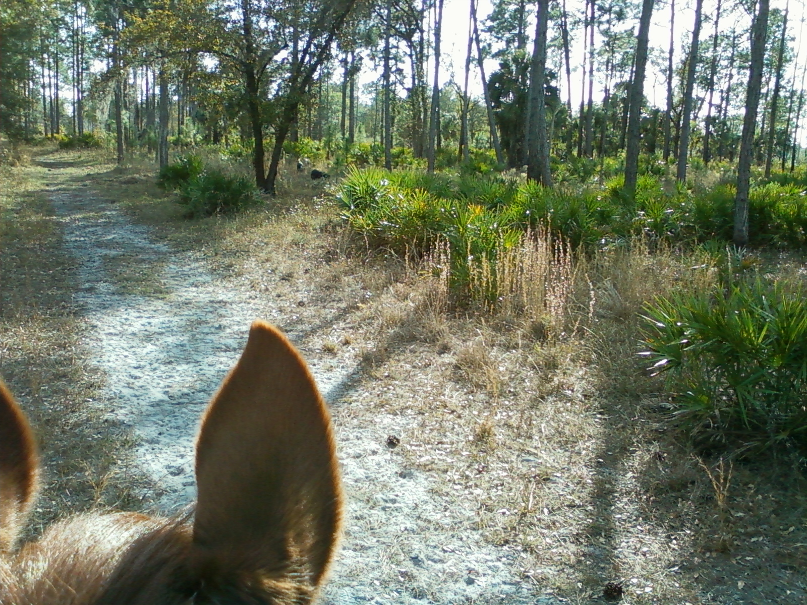 First things first today, I had to run down and drop off an envelope for the outgoing mail at the ranger station, running the gauntlet through the sugar sand again, slipping and sliding in several spots, but it was to pay our taxes, so I couldn’t let it go another day. Got back and had a leisurely breakfast, and did some work on the computer. Just as we were getting ready to go, I got a call from my brother here in Florida (the one we’re on our way to visit), to tell me that one of our other brothers (who was supposed to be flying from Texas to Florida today for a week of rest and to visit the same brother) was in the hospital undergoing some sort of heart surgery. Not a heart attack, apparently, but a torn aorta. Kept the phone with me for updates, and fortunately, the surgery went well and he’s going to be under careful observation for a few days, but don’t know yet about the recovery involved. Easy to deduce he won’t be flying to Florida any time soon! Well, Hubby had already saddled up his horse, so I saddled mine and away we went! It was an absolutely perfect day weather-wise, one of the best we’ve had in awhile, so nice I only had to have a tank top on. It’s great to get some sun. We did the full official trail today, which is about 10 miles, but we saw lots of side trails we’ll explore later in the week. It began with a very long, very straight stretch with old growth and palm trees along a little river which is shared with the bikers (we passed several along the way), crossed a good sized wooden bridge over the river, then eventually worked our way out to the country road. The trees thinned out until we were essentially in almost open fields with just a few pines and lots of squash palms. After that we crossed the county road, did some pretty straight runs along the boundary, came across a lot of pig sign that got the horses snorting and whirling around a bit. We crossed the road again and came across some actual pigs crossing the trail, a couple of mamas and some babies, and the horses were like statues at first. Once they caught sight of us, they ran off, which seemed to give Apollo some confidence, so he strutted past the area with a bit more panache and a lot less fuss. I guess he finally figured out that the pigs were more afraid that we were pig-eating monsters than he was that they were horse-eating pigs. We had some fantastic canters and lovely long trots, as everyone is getting more and more fit. We even trotted across the bridge on the way back, about 10-15 yards of planking that made a wonderful clippety-clop sound as we went over it. A great ride! We arrived back at camp about 4:00, just as one of my brothers texted me to let me know that my other brother was out of surgery and seemed to be doing okay, though we’ll know better in a few days in the ICU. Settled in for a relaxing evening, enjoying the quiet solitude of this place.