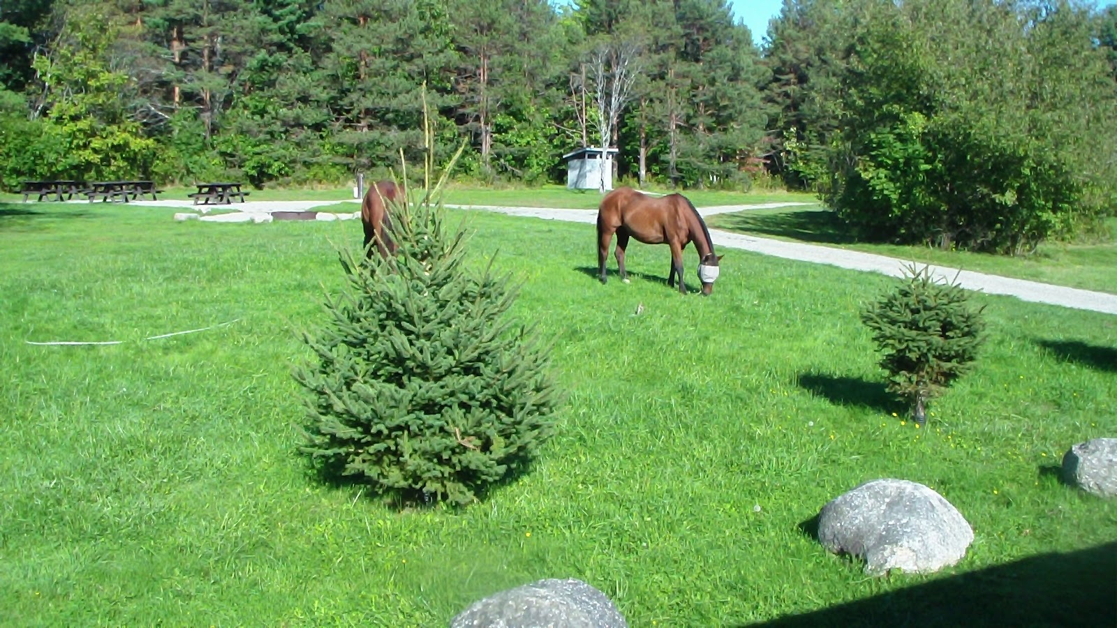 Got up at our usual, non-travel day time (about 9:00), though Hubby had to slip out of bed a half hour earlier to turn on the furnace. It had been a cold night, and we were glad the horses had on their winter blankets. After a leisurely breakfast, we had a discussion about where to ride today. We had two versions of the trail maps from here, and they didn’t agree on a lot of points, with lots of multi-use trails that suddenly changed into hiking trails, or dead-ended, or became forest and sometimes even county roads. I finally managed to chisel out a loop, and downloaded it onto my GPS for backup. As we were saddling the horses, a young ranger I had spoken with yesterday came over with another set of maps that Karen, one of the workers here, had highlighted for me. I was pleased that the trail I had planned was almost exactly the same route, so off we went, fairly certain we wouldn’t have much trouble following that route. Alas, it didn’t quite work out that way. We were delighted with the first part of the trail, it being more of a trail and less of a road that we thought it might be, but before long, we ran into our first map problem. After passing through a parking area, which we expected, we soon came to a road, which we also expected. According to the map, we were to take a left and cross the main road, 232, to the trail on the other side. We crossed the road, but couldn’t find the trail. Worse, when we crossed the road, we were at the entrance to a place to Owl’s Head, which, according to the map, should have been some distance north of the road crossing that we were supposed to be making. Since I had based my GPS directions on the inaccurate map, that didn’t help much. I finally decided we would go back up the road in the other direction and see what happened. Before long, we were approaching what was obviously private property, and were almost ready to turn back when I saw an intersection ahead with what looked like street signs of a sort. When we got to the intersection, we saw another road sign assuring us we were on Lanesboro Rd., but it also indicated the crossroad we were facing was the Cross Vermont Trail. Well, we knew we wanted to go south, so we turned left and followed the trail in that direction. We soon ran into some bikers, but they were just visitors and couldn’t help us, and in fact, they thought they might be lost, too. Anyway, it was obviously a rails-to-trails road, but they put a really nice footing on it, so it was a nice ride, partly circling a large pond, until we came to an intersection. We knew we needed to go east at some point, and the GPS seemed to indicate this would get us back on track, so we turned left again, heading downhill for quite some time until we ran into 232 again. This time when we crossed it, we clearly found the trail we were looking for and breathed a sigh of relief. Again, it was long and straight, right through a beautiful forest, so picturesque with the trees all turning colors, it almost took our breath away. Got in some lovely trots and canters as well, it being so straight and wide. Eventually we reached our next left turn, which took us toward a campground by a lake. Again, the map was vague, and we wandered through the campground for a while, watered the horses at the lake before deciding to take a little hiking trail with a sign that said “to store.” It got too narrow, but paralleled the road, so as soon as we could we moved out, passing the general store (closed), passing the Big Deer campground, running into some road traffic along the way, before finally reaching the Nature Center, which, according to Karen’s map, would lead us to another trail that would bring us north again. We circled the Nature Center looking for a suitable trail, and found only two trailheads, both of which seemed to narrow and close for horses, but we finally found one that had the name of the trail we thought we needed, Hosmer Brook, and headed out on it. It was narrow and rocky, and at one point, there was a 6-inch diameter tree across the trail with no safe way around it, so I got out my trusty folding camp saw and spent 10 minutes cutting it and pushing it out of the way. Soon afterward, we came across a bog that only had a two-plank, loose boardwalk, which was not suitable for horses either, but since our horses are so experienced, they managed to get across okay, with Apollo only slipping once on one foot in the back but quickly recovering. That horrible trail finally ended up on a newly-bulldozed trail, again with no markings, so first we went right, thinking that would take us north, but then I didn’t trust the newness of the trail, so we turned around and headed left instead. That bulldozed section soon met up with an older established trail, and, at last we found a trail marker indicating we were coming out of multi-use trail! We took that trail north, and seemed to finally be on the right track on something known as the Telephone Line Trail. That ended at another intersection that had no markings, except for the trail from which we emerged. We knew we were close to the campground, but wasn’t sure if we needed to go straight or turn left. We turned left, but then my GPS indicated we were heading too much west and not enough north, so we turned back and sent straight for more than a mile, before once again deciding we were on the wrong track, and had to turn around again. By this time we were exhausted, having been in the saddle for more than 4 hours, and not in the mood for more map mistakes. We headed back to the intersection and took the road we thought was going too westerly, but it turned out to be correct, and that we were only about a quarter mile from the campground. So far out of our way, just because they didn’t have a sign or a trail marker indicating the way back to camp! So even though the trails were very enjoyable, and there were many more of them than the map indicated, the day was a bit spoiled becau