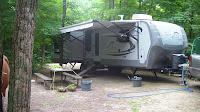 Everyone slept late this morning, with Hubby and I waking up to the sound of hearing our niece creeping into the RV. She did such a quiet job, neither one of our fearless watch dogs even moved! That was almost nine, so we got up right afterward. Breakfast soon followed, then a lesson in getting her horse ready to go (Hubby generously helped her get his Clio ready), then we finally headed north out of the camp, to explore the two loops that Hubby and I didn’t take on our Wednesday ride. More of the same wide gravel trails in deep woods, though not as many climbs or as steep grades, and no water crossings, which was probably good for a first day for her. There was a breeze from the north that chilled things a bit, and we both had to put on a long shirt over our t-shirts. Ended up doing about 4 miles, out under 90 minutes, which again, is a good ride for a novice. We don’t want to wear her out on her first day! Once we got back to camp, we tackled the job of setting up the high-line post, which didn’t take long, and seemed to work fairly well. We put the horses on it and watched for awhile, and all seemed well. A while later, the post got pulled down by Apollo because he wrapped himself around the end then tried to turn back toward his hay bag on the other side. We set it back up and tightened down some more, and we had no more trouble with that the rest of the day. Decided to have a rare campfire to cook bratwurst, but the wood was so wet it took quite a lot of doing in order to get it started, but we managed to do it, and to indulge on s’mores afterwards. It was a very nice evening, and delightful spending time with my niece. We watched a horsey movie until about 10, then everyone went off to bed.