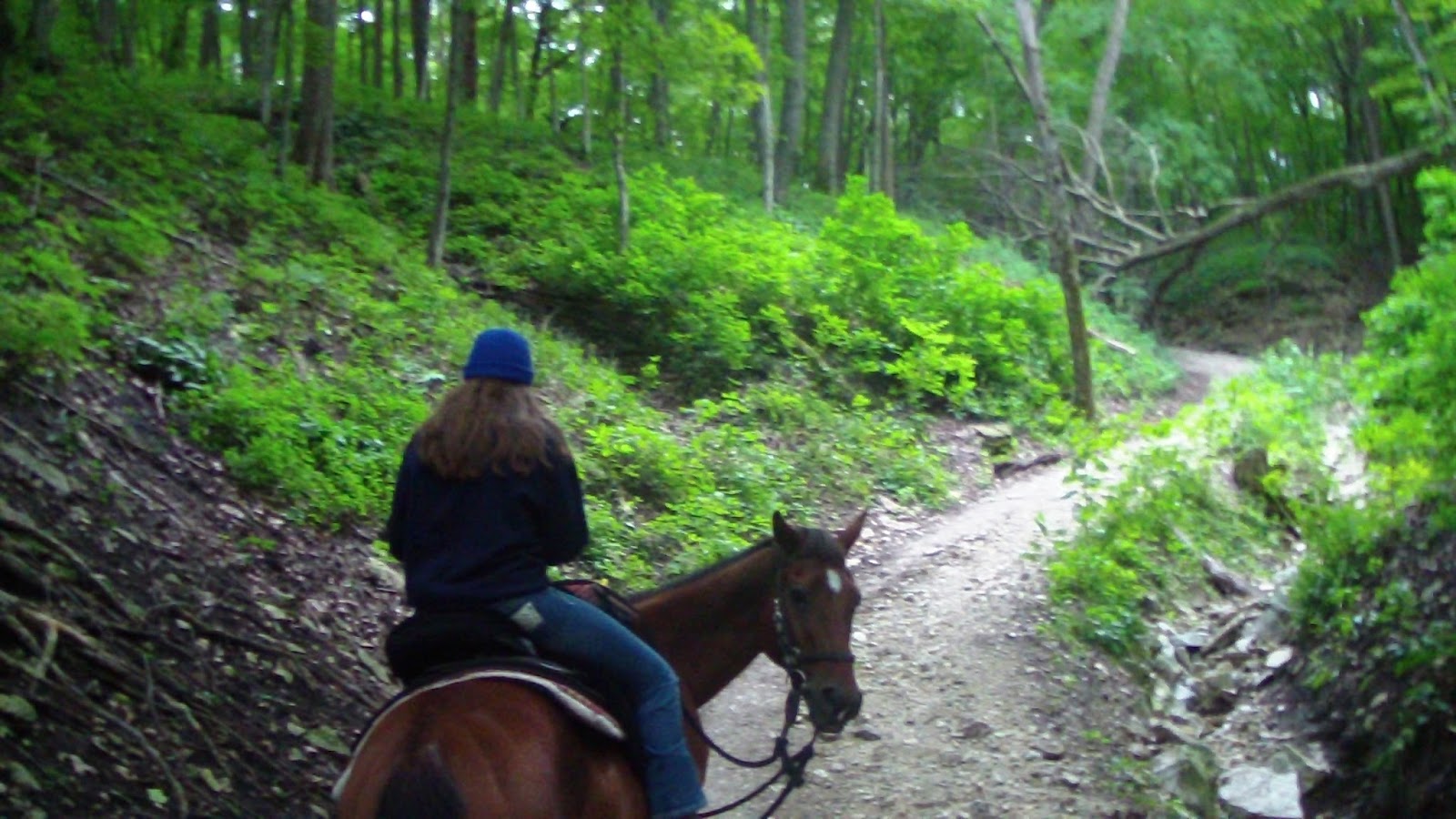 After waking up early, I was out feeding the horses when the ranger came by to first tell me that one of my packages had arrived, and secondly to tell me we couldn’t highline the horses. Even though we had used tree saver straps, the rule is no high-lining (and, in his words, “I am the rule and it’s not open for discussion,”) because he claimed it caused too much damage. It was okay if we wanted to put up a portable electric fence around the hitching post, but otherwise the horses would have to stay tied to the hitching post. Can you imagine? If I tied horses to a hitching post for 10 days and nights in most places in the country, I could get arrested for animal abuse! Well, even though I kept a smile on my face the whole time, I was very annoyed, because the location of the hitching post was quite close to the tent, and even though there was little danger of the horses trampling the tent, it was certainly close enough for the proximity stray manure to be uncomfortably close, unless we tied them so tightly they couldn’t move around to the other side, in which case they’d hardly be able to move. We considered moving the tent, but there really wasn’t anyplace else as ideal, so we left it, trying to figure out an alternative. We’ve never had a portable fence, and even though there may have been a few places where it would have been handy, it never seemed worth the considerable investment and space to carry one. Nor am I convinced Apollo would stay inside it, he’s a Houdini when it comes to escaping from containment. Anyway, we decided to consider our options further later on. Meanwhile, in the afternoon we headed out for our first ride, anxious to see what the trails were like here. We decided to first go down the historic site of Forestville, since Hubby may not be able to ride again this week, and he was interested in seeing it. As we headed out the trails, we were happy to see that the gravel we had been warned about on the trails was mostly pea gravel on top, so the boots were sufficient to protect the horses’ front feet quite reasonably adequately. We rode about 5.2 miles in all, take the most direct route to Forestville from the campground, past the site of the old distillery (which closed down after the Civil War due to the imposition of an alcohol tax-typical government job destruction), then down to the town, or not really a town, just a store and a couple of out buildings. The sign said it’s only open from Thursday-Sunday, and I think I read where they have folks in pioneer costume doing pioneer things, so that might be fun over the weekend. I also read that they’re having a Civil War Encampment reenactment this weekend, so that will be interesting to come back again. Next we headed out to the south loop, making several water crossings, missing one turn, backtracking then climbing the hill to come back to the camp on the opposite end from where we left. We actually rode about 2/3 of the park, and were still only gone about 2 hours. Not as big a park as I thought, but will still serve the purpose quite nicely. The woods here are close and often eerie, but the trails are wide and very well traveled, with horse manure about every 10-20 yards for most of the journey, although we didn’t meet any other riders on the trail. Put the horses back up on the hitching rail, did our chores and settled down for the evening.